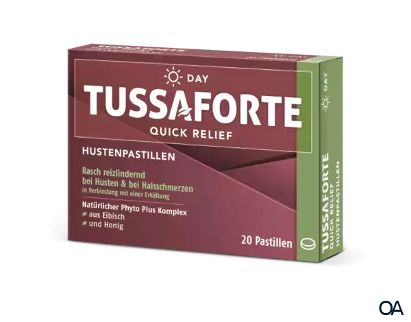 - 1 TUSSAFORTE Quick Relief Hustenpastille enthält: 125 mg Eibischwurzeltrockenextrakt 125 mg Honig