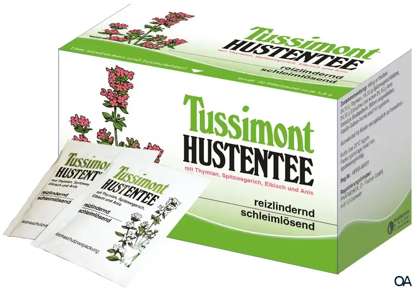- Die Wirkstoffe in 100 g TUSSIMONT HUSTENTEE sind: 24,15 g Thymian, 19,35 g Spitzwegerichblätter, 24,15 g Eibischwurzel, 24,15 g Anis.