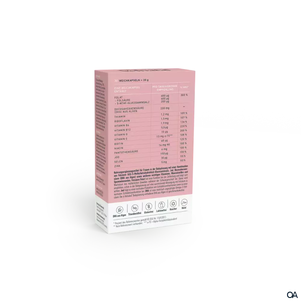 Die Inhaltsstoffe von Velnatal® Babyplanung wurden sorgfältig ausgewählt. um dich bestmöglich auf deinem Weg zur Schwangerschaft zu begleiten. Die Kombination aus Spurenelementen, Vitaminen und Fettsäuren bereitet den Körper auf eine Schwangerschaft vor. Es enthält u. a. Folsäure, denn eine ausreichende Folat-Versorgung ist bereits vor der Schwangerschaft besonders wichtig.