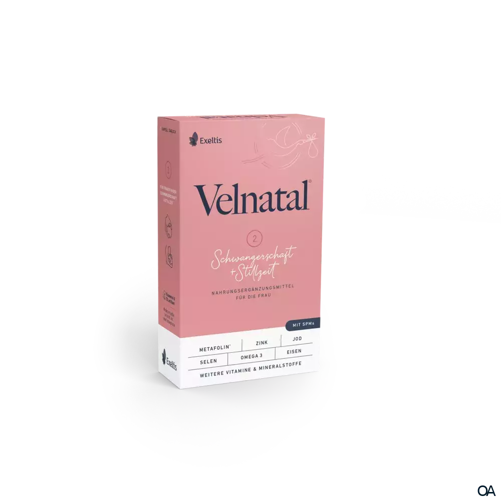 - Folsäure/Folat: Wird auch als Vitamin B9 bezeichnet und ist wichtig für die Zellteilung und das mütterliche Gewebewachstum, besonders in den frühen Entwicklungsphasen einer Schwangerschaft. Velnatal® Schwangerschaft + Stillzeit enthält Metafolin®' - die biologisch aktive Form der natürlichen Folsäure, die nicht verstoffwechselt werden muss und so für Baby und Mutter sofort zur Verfügung steht. Ein niedriger Folatspiegel gilt als Risikofaktor für die Entstehung eines Neuralrohrdefektes beim heranwachsenden Fötus. Deshalb wird Frauen mit Kinderwunsch die Einnahme von 400 µg Folsäure täglich mindestens 1 Monat vor und bis zu 3 Monate nach der Empfängnis empfohlen. Die Entstehung eines Neuralrohrdefektes ist durch mehrere Risikofaktoren bedingt, die Veränderung eines dieser Risikofaktoren kann eine positive Wirkung ergeben oder auch nicht.
