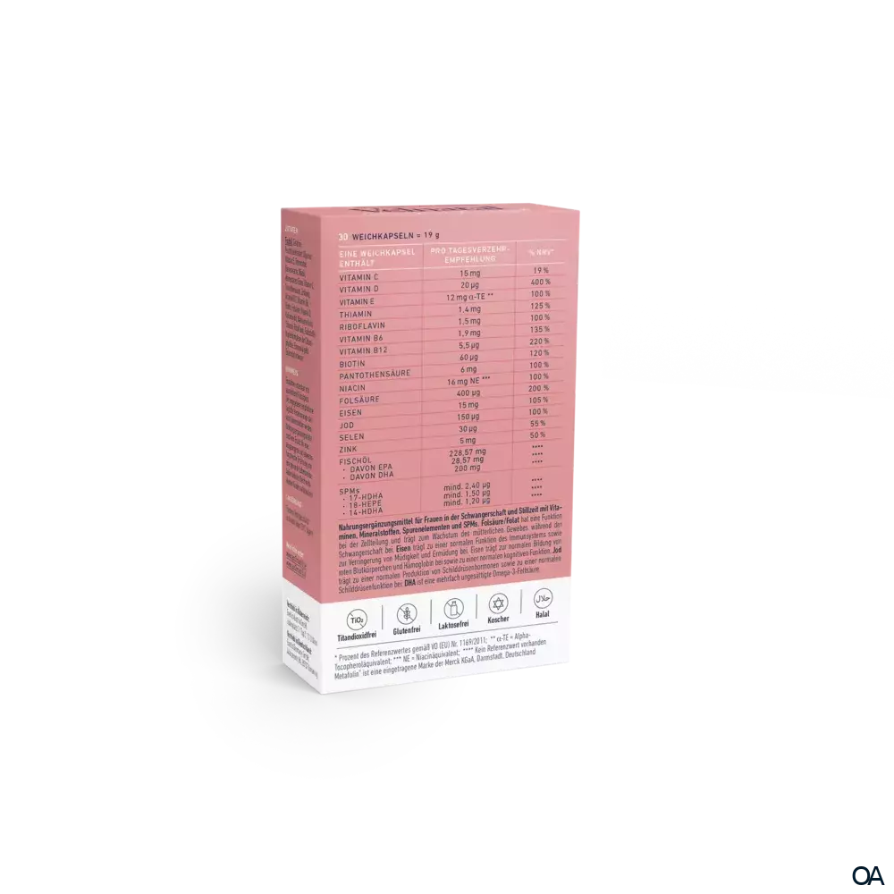 - Zusammensetzung pro Tagesdosis (1 Kapsel) %NRV*: Vitamin C 15 mg 19 %, Vitamin D 20 µg 400 %, Vitamin E 12 mg α-TE*** 100 %, Thiamin 1,4 mg 125 %, Riboflavin 1,5 mg 105 %, Vitamin B6 1,9 mg 135 %, Vitamin B12 5,5 µg 220 %, Biotin 60 µg 120 %, Pantothensäure 6,0 mg 100 %, Niacin 16 mg NE**** 100 %, Folsäure 400 µg 200 %, Eisen 15 mg 105 %, Iod 150 µg 100 %, Selen 30 µg 55 %, Zink 5 mg 50 %, Fischöl 228,57 mg ** - davon EPA1 28,57 mg ** - davon DHA2 200 mg **, SPMs (specialized, pro-resolving mediators) 30 mg ** - davon 17-HDHA3 mind. 2,4 µg ** - davon 18-HEPE4 mind. 1,5 µg ** - davon 14-HDHA5 mind. 1,2 µg **. *% der Referenzmenge gemäß LIMV (EU) Nr. 1169/2011, ** keine Empfehlungen in der LIMV vorhanden. ***TE = α-Tocopheroläquivalent. ****NE = Niacinäquivalent. 1 Eicosapentaensäure. 2 Docosahexaensäure. 3 17-Hydroxydocosahexaensäure. 4 18-Hydroxyeicosapentaensäure. 5 14-Hydroxydocosahexaensäure.