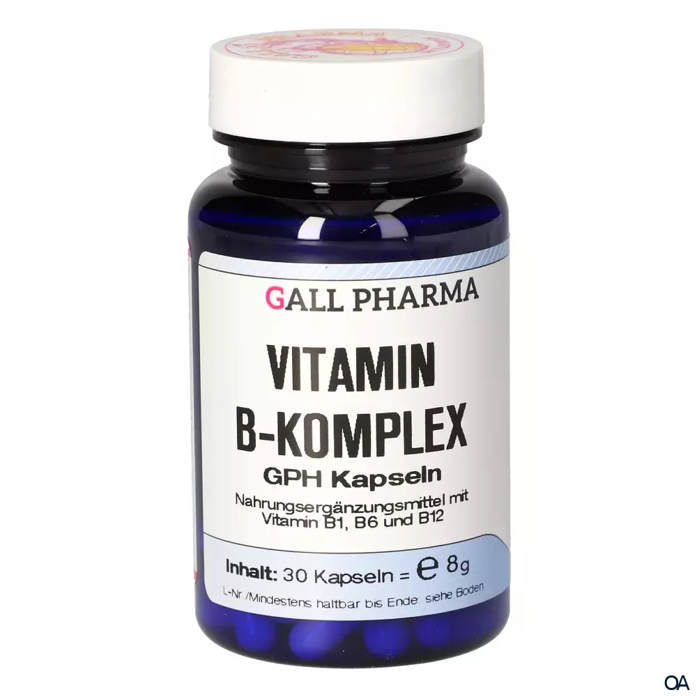Die Vitamine des B-Komplexes ergänzen einander in ihrer Funktion indem sie die zelluläre Enzymaktivität anregen. Da diese wasserlöslichen Vitamine im Körper nicht nennenswert gespeichert werden können, ist eine ständige Zufuhr notwendig. Vitamin B-Komplex GPH Kapseln enthalten 11 mg Vitamin B1 (als Thiamin HCl), 14 mg Vitamin B6 (als Pyridoxin HCl) und 25 μg Vitamin B12 (als Methylcobalamin) in einer Hartgelatinekapsel.