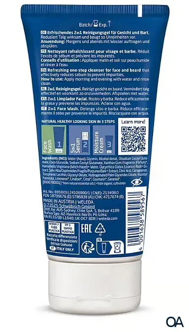 Weleda FOR MEN 2in1 Face Wash mit natürlichen Inhaltsstoffen reinigt die Haut porentief. Die erfrischende Reinigung reduziert Talg wirksam und beugt so Unreinheiten vor. Auch als Bart-Shampoo geeignet.