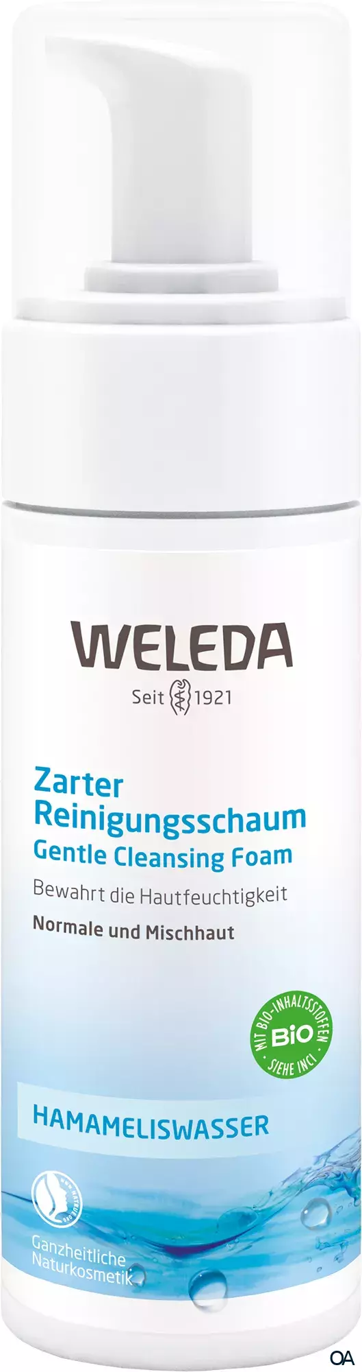 Zarter Reinigungsschaum mit Bio-Hamamelis und Eibischwurzel. Der zarte Reinigungsschaum reinigt die Gesichtshaut porentief, befreit sie von Make-up und überschüssigem Hautfett und erhält die natürliche Feuchtigkeitsbalance der Haut. Die Rezeptur mit Bio-Hamamelis erfrischt die Haut und bereitet sie optimal auf die anschließende Pflege mit den Weleda Gesichtspflegeserien vor.