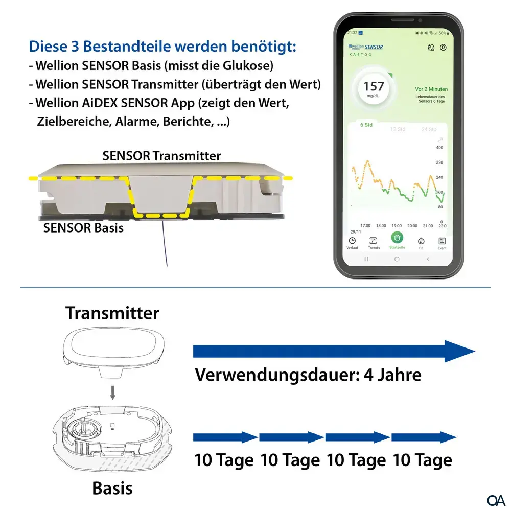- Wellion AiDEX SENSOR App: Die App empfängt die gemessenen Werte vom Transmitter und dient zum Auslesen der Daten. Die App ist für Android und iOS erhältlich.