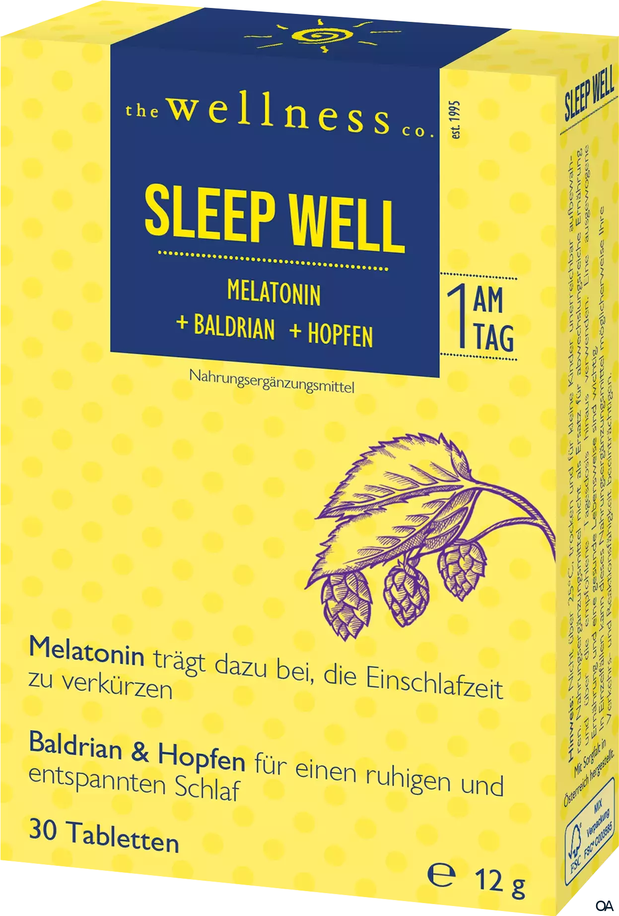 Wellness Sleep Well Tabletten sind ein Nahrungsergänzungsmittel. Melatonin trägt dazu bei, die Einschlafzeit zu verkürzen. Baldrian und Hopfen unterstützen einen ruhigen und entspannten Schlaf.