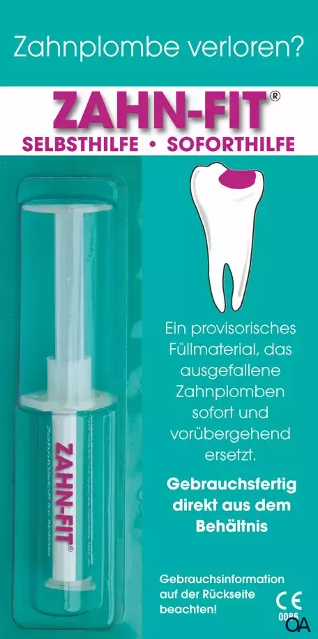 ZAHN-FIT® ist ein Medizinprodukt der Klasse 2a. ZAHN-FIT® ist ein sicheres, auf Zinkoxid basierendes Zahnfüllmaterial, das bei Kontakt mit Speichel aushärtet. Es wird verwendet, um Hohlräume im Zahn zu füllen, die nach dem Verlust einer Gold-, Amalgam-, Kunststoff- oder Keramikplombe entstehen. Einmal appliziert bietet ZAHN-FIT® ausreichenden, vorübergehenden Schutz für den Zahnpatienten. Man kann in Ruhe und ohne zeitlichen Druck einen Zahnarzttermin vereinbaren. Zahnärzte sind mit Provisorien dieser Art vertraut und können ZAHN-FIT® ohne Probleme entfernen.