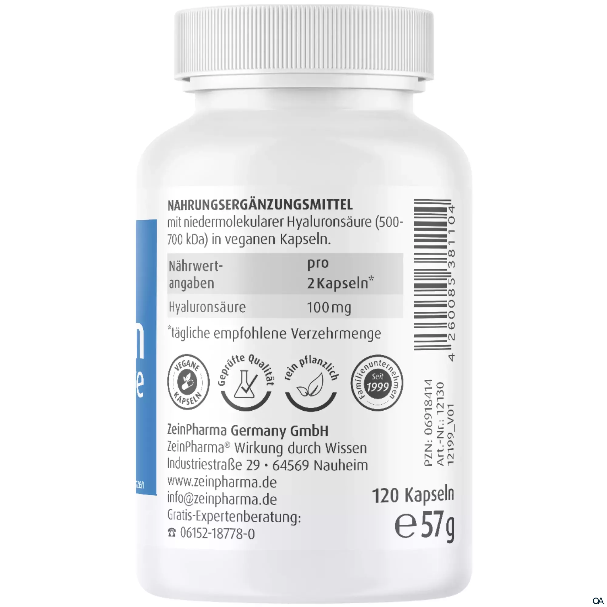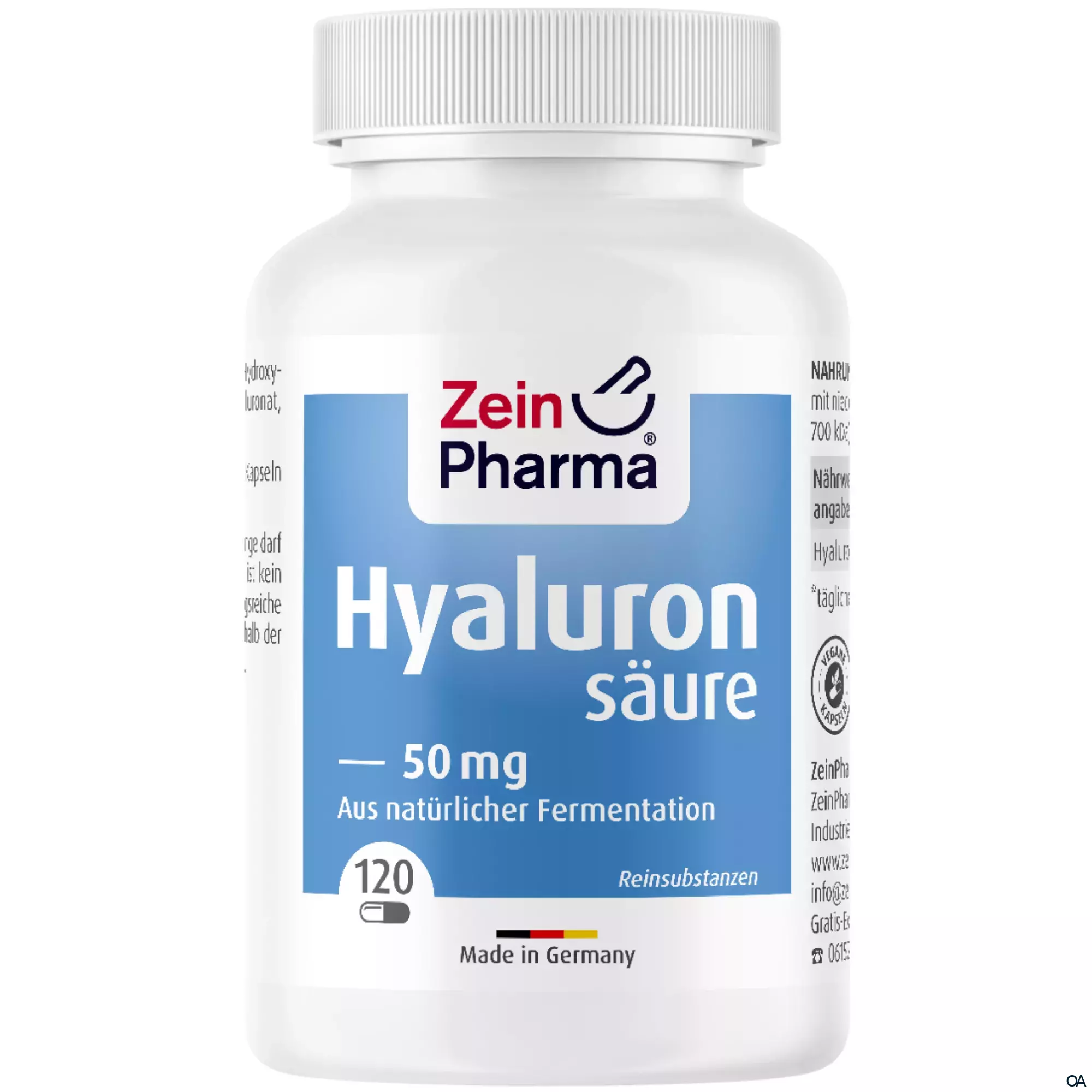 Die ZeinPharma Hyaluronsäure 50 mg Kapseln sind ein Nahrungsergänzungsmittel mit niedermolekularer Hyaluronsäure aus natürlicher Fermentation und durch Molekülgrößen von 500-700 kDa hochbioverfügbar.