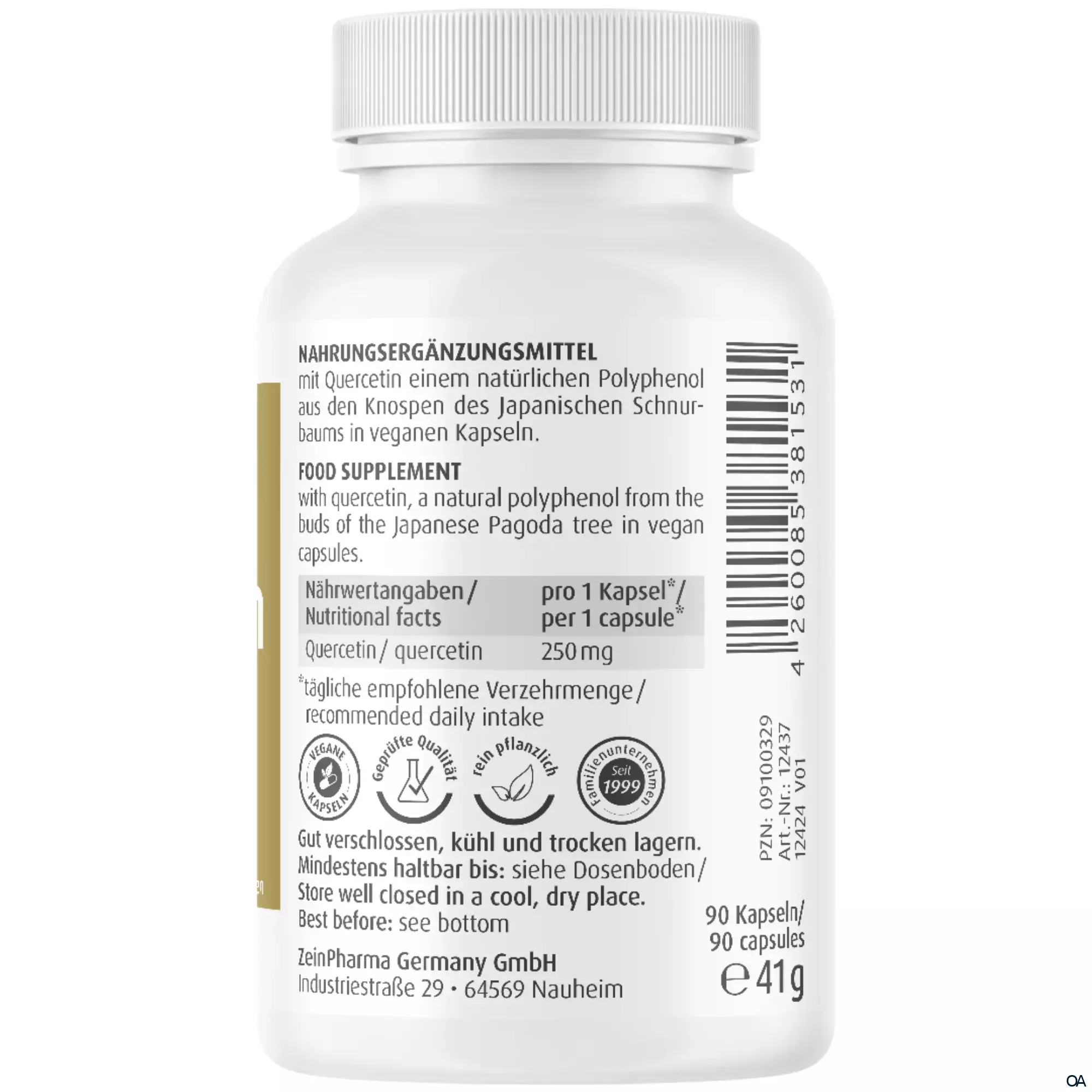 - Nährwertangaben pro 1 Kapsel*: Quercetin 250 mg. * tägliche empfohlene Verzehrmenge.