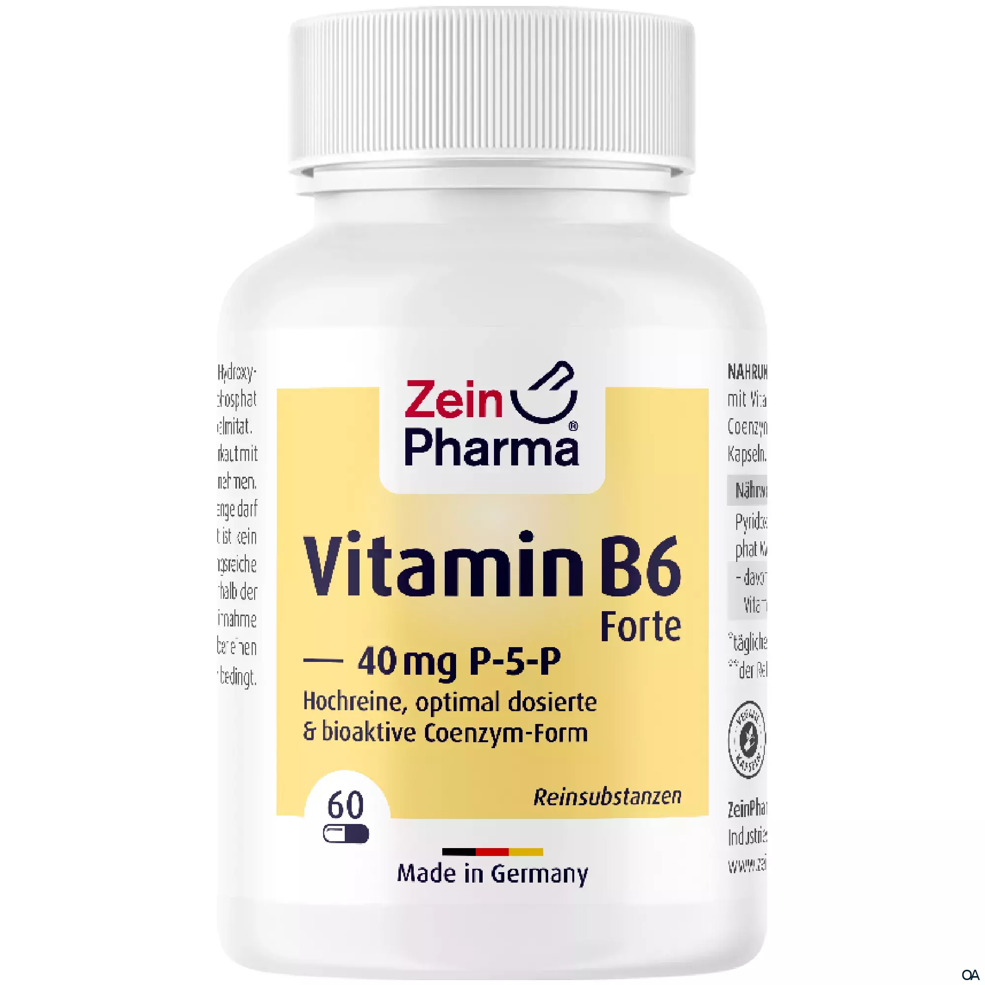 Die ZeinPharma Vitamin B6 Forte P-5-P 40 mg Kapseln sind ein Nahrungsergänzungsmittel mit Vitamin B6 in seiner aktiven Coenzym-Form, Pyridoxal-5-Phosphat, in vegetarischen Kapseln.