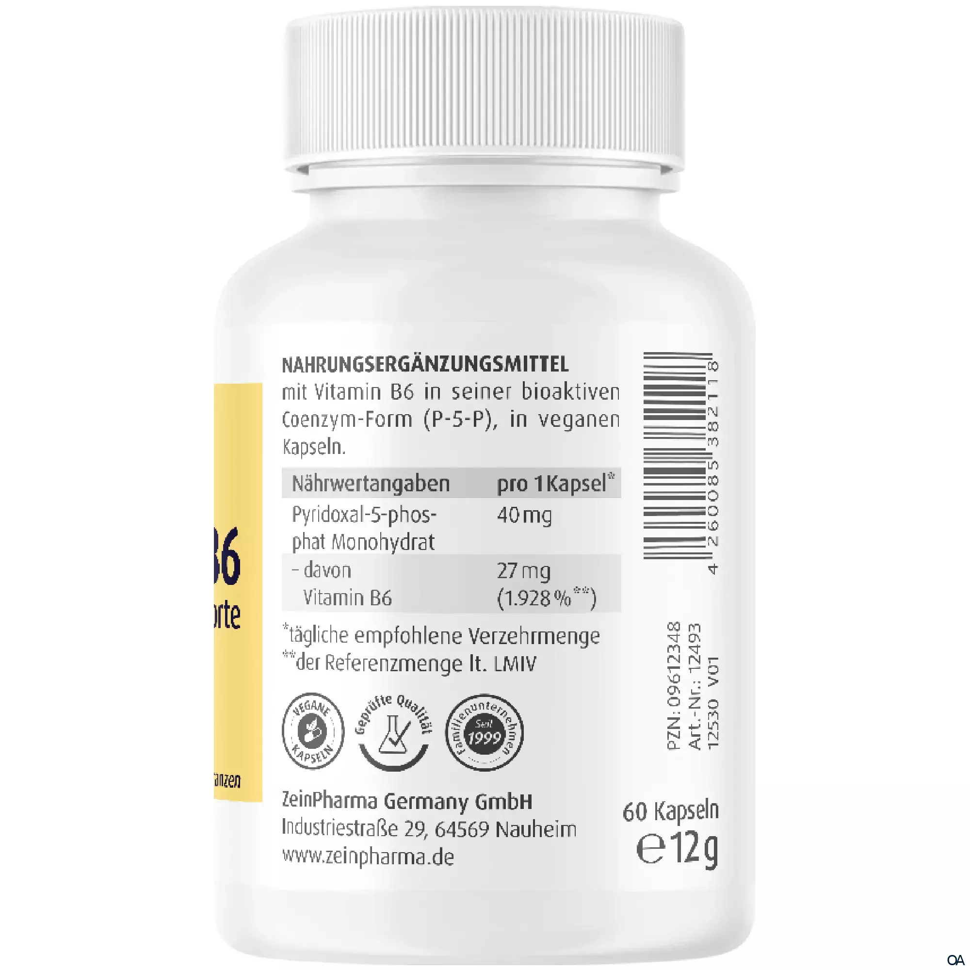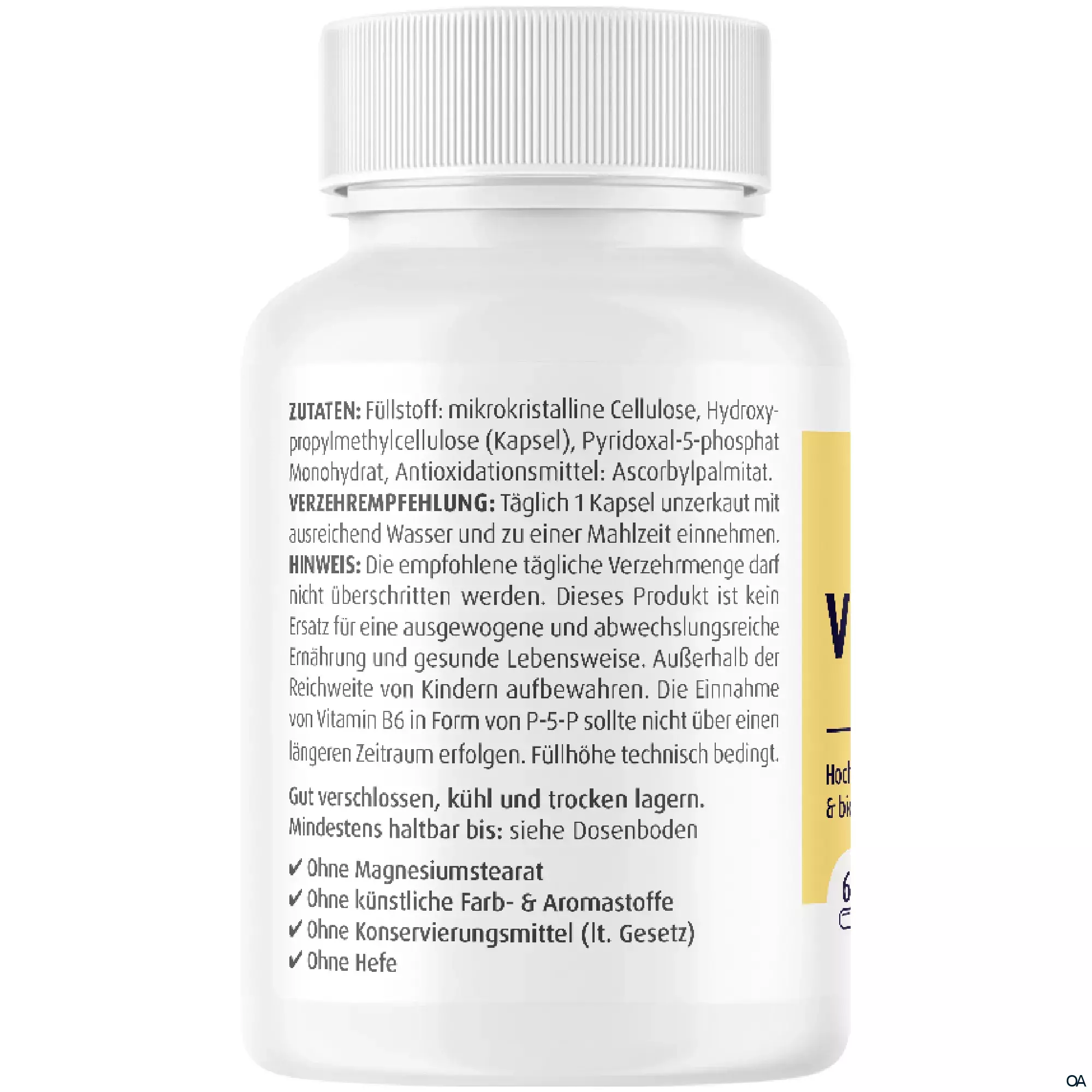 - Zutaten: Füllstoff: mikrokristalline Cellulose, Hydroxypropylmethylcellulose (Kapsel), Pyridoxal-5-phosphat-Monohydrat, Antioxidationsmittel: Ascorbylpalmitat.