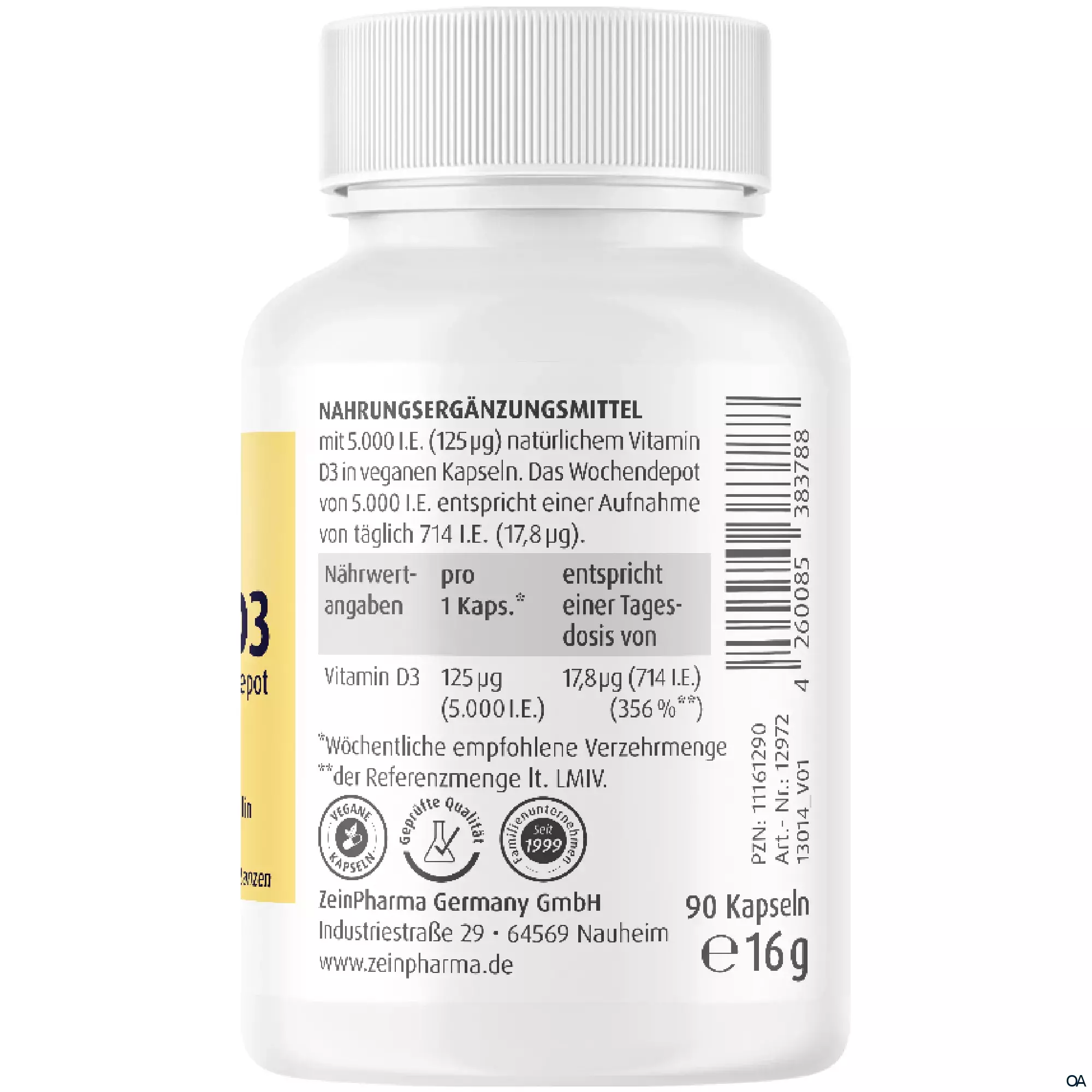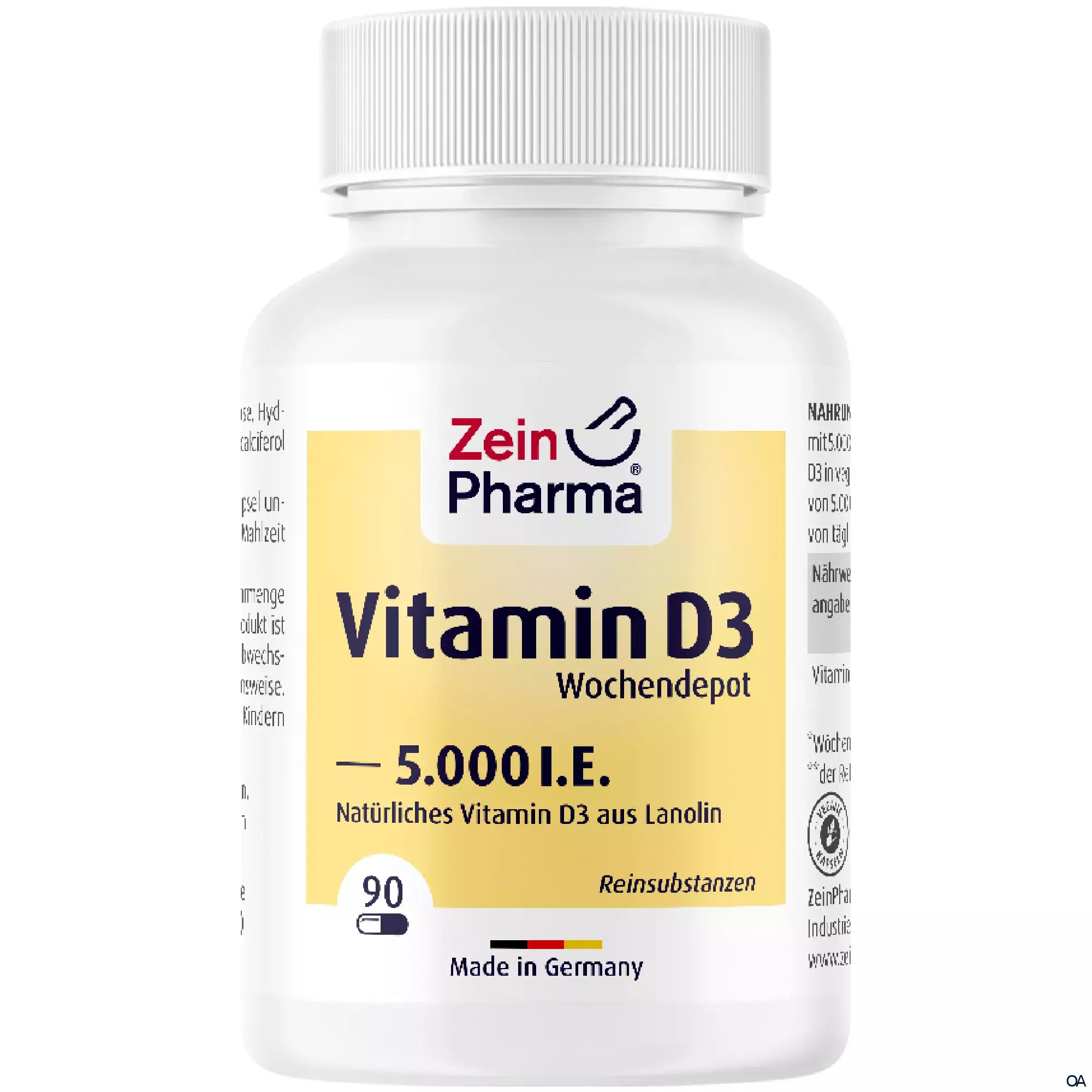 Die ZeinPharma Vitamin D3 Wochendepot Kapseln 5.000 I.E. sind ein Nahrungsergänzungsmittel mit 125 μg natürlichem Vitamin D3 aus Lanolin in veganen Kapseln.