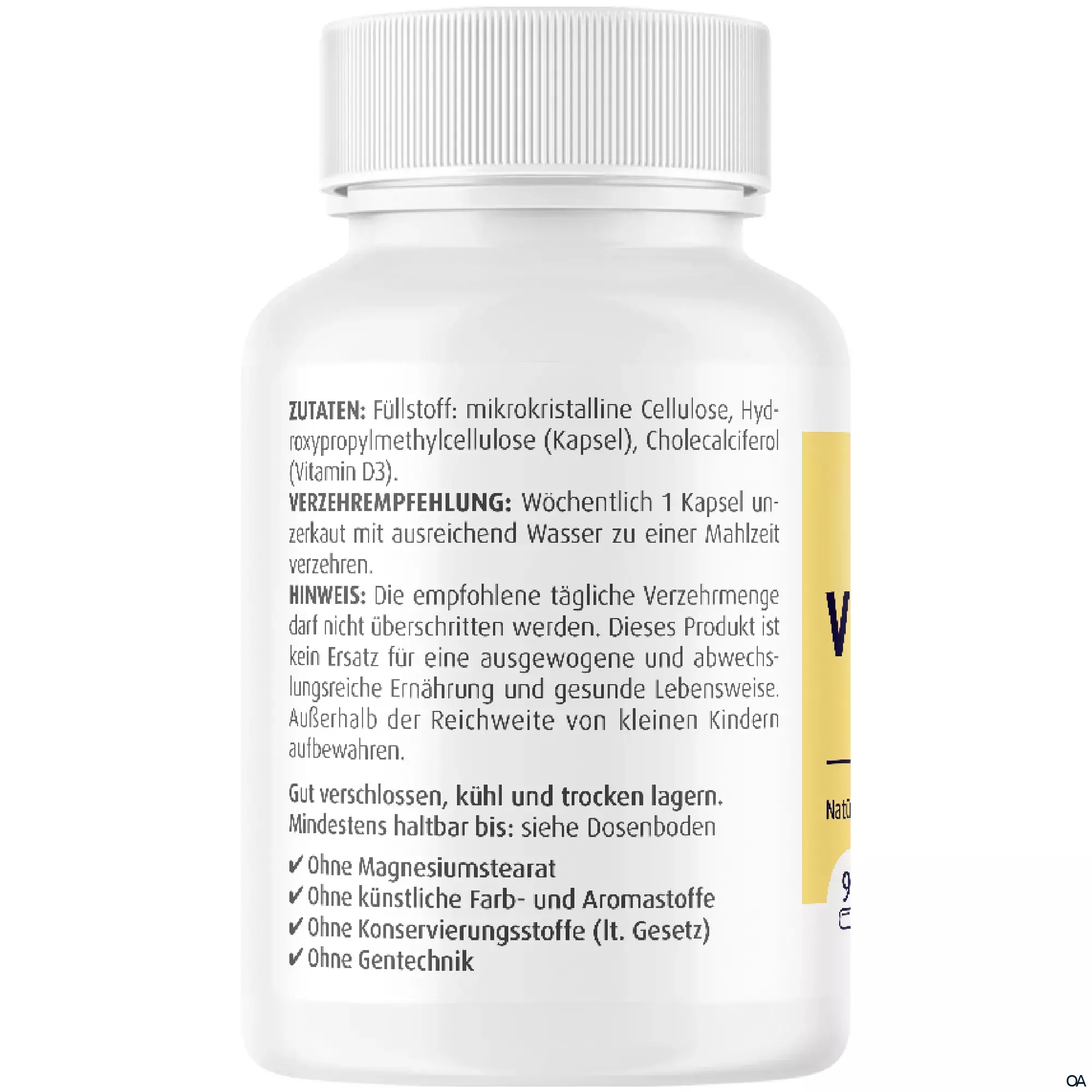 - Zutaten: Füllstoff: mikrokristalline Cellulose, Cholecalciferol (Vitamin D3), Hydroxypropylmethylcellulose (Kapsel).
