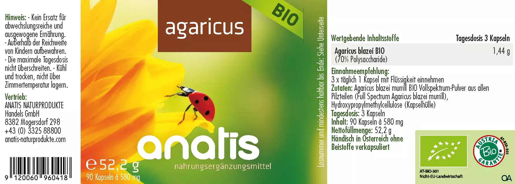 anatis Agaricus Pilz BIO Kapseln ist ein Nahrungsergänzungsmittel mit Vollspektrum-Pulver aus allen Pilzteilen des Agaricus blazei murrill Pilz.