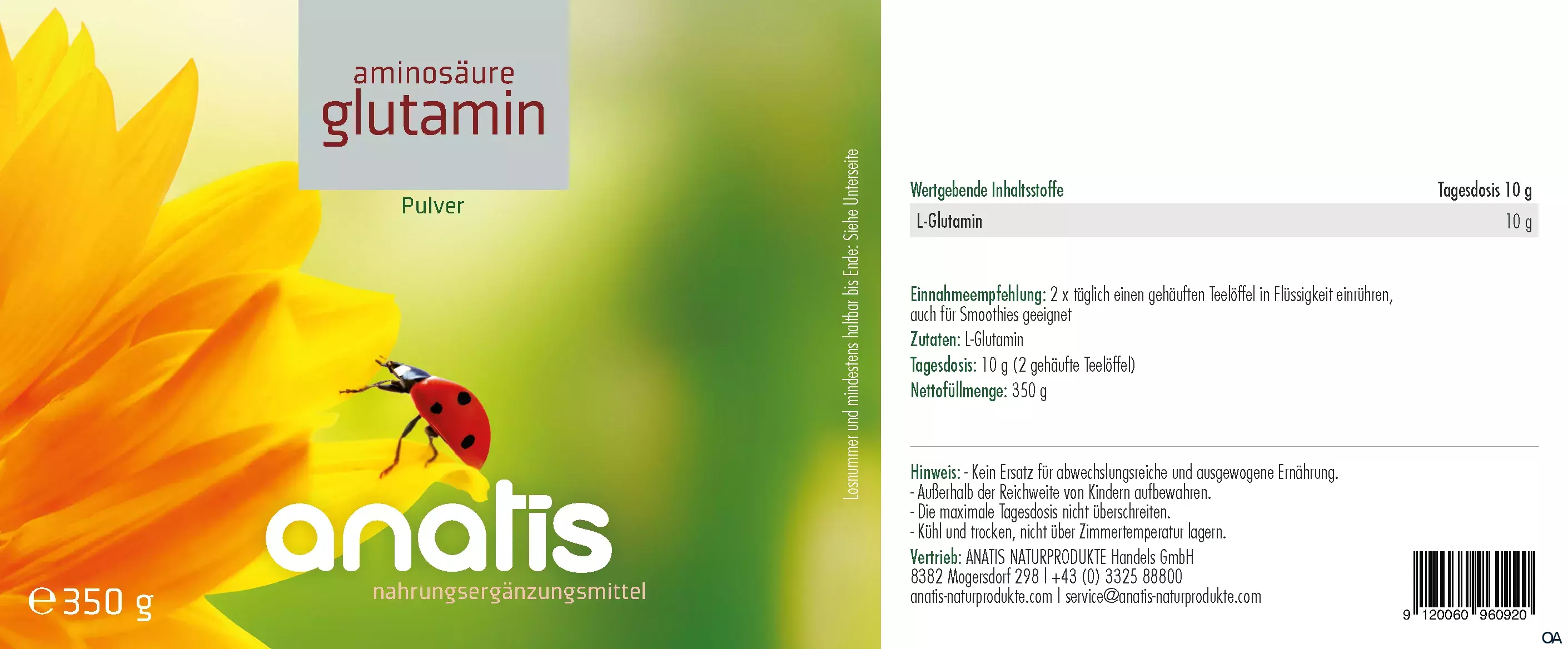 anatis Aminosäure Glutamin Pulver ist eine Nahrungsergänzungsmittel aus fermentierten Pflanzen. Zur Einnahme für die Wundheilung, Bildung von Antioxidantien, stärkt das Immunsystem, bei chronisch-entzündlichen Darmerkrankungen.