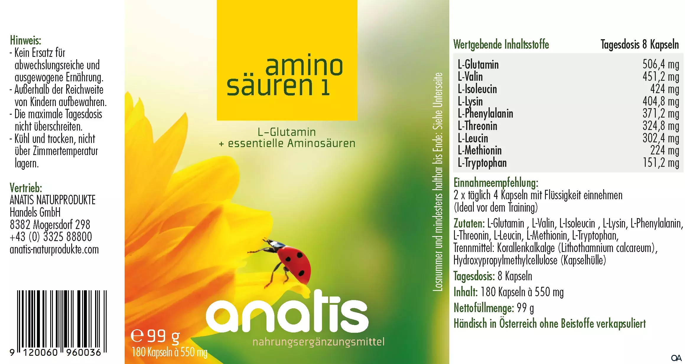anatis Aminosäuren I Kapseln ist ein Nahrungsergänzungsmitteln bestehend aus allen acht essentiellen Aminosäuren und L-Glutamin. Die Inhaltsstoffe werden durch Fermentation aus Pflanzen gewonnen.