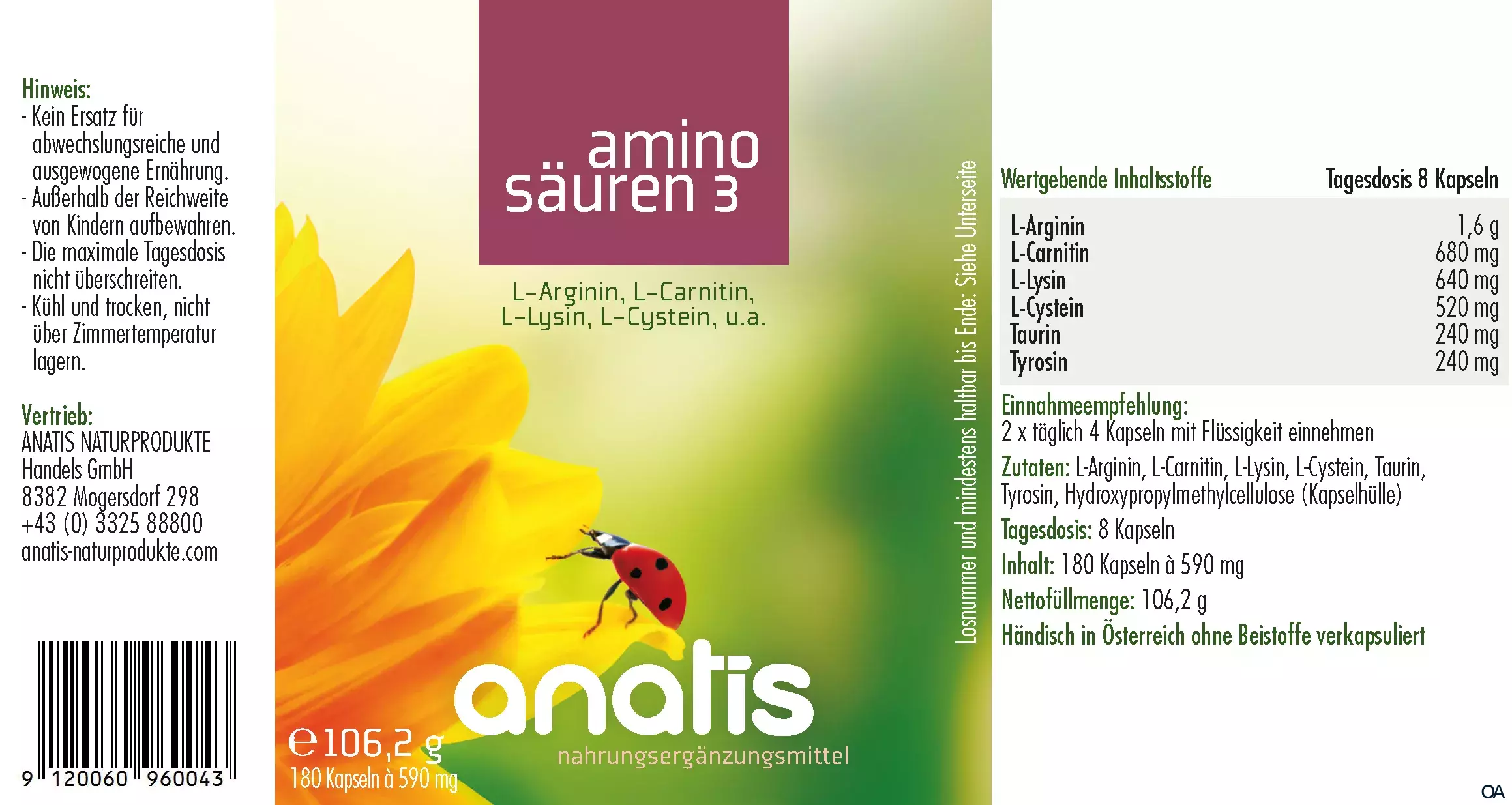 anatis Aminosäuren III Kapseln ist ein Nahrungsergänzungsmittel mit den Aminosäuren L-Arginin, L-Cystein, L-Lysin, L-Carnitin, Tyrosin, Taurin.