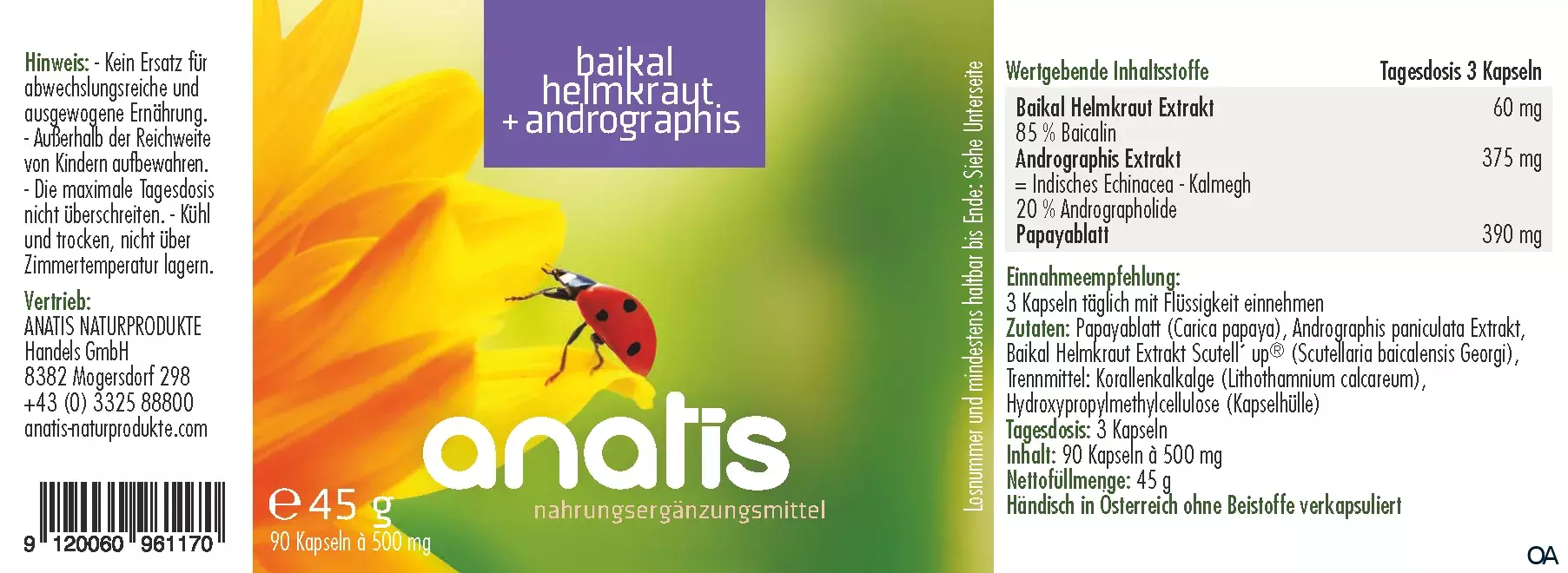 anatis Baikal Helmkraut + Andrographis Kapseln ist ein Nahrungsergänzungsmittel mit Baikal Helmkraut Extrakt 85 % (Scutell up®), Andrographis paniculata Extrakt 20 % und Papayablatt.