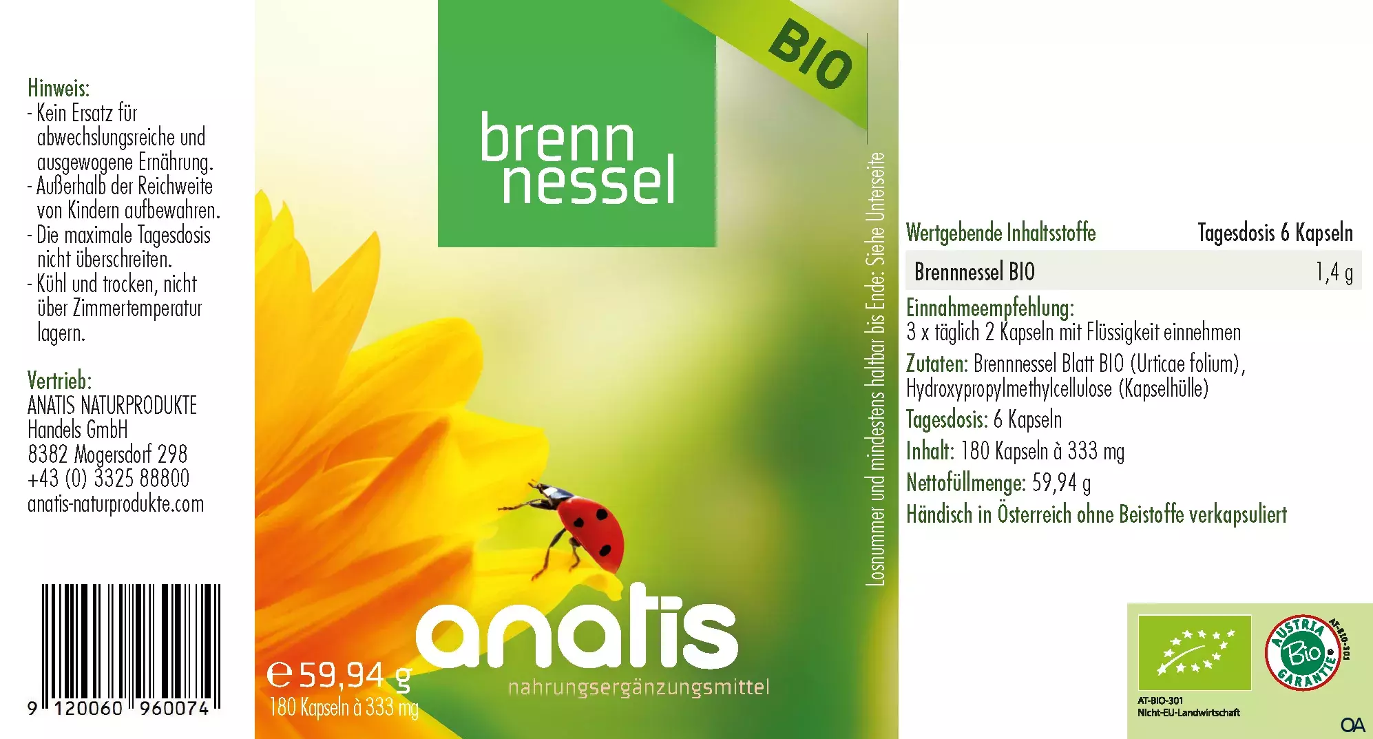anatis Brennnessel BIO Kapseln ist ein Nahrungsergänzungsmittel bestehend aus Brennnesselblättern aus Wildsammlung.