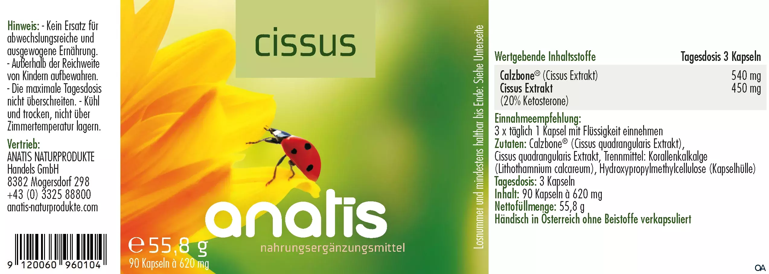 anatis Cissus Kapseln ist ein Nahrungsergänzungsmittel bestehend aus Calzbone Extrakt aus Cissus quadrangularis (patentiert). Cissus Extrakt aus 20 % Ketosteronen.