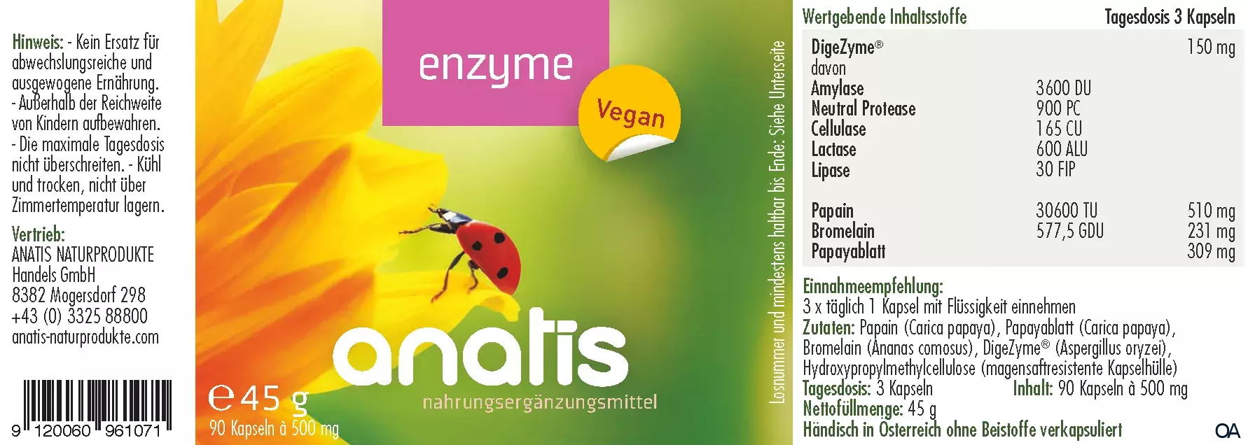 anatis Enzyme Kapseln ist ein Nahrungsergänzungsmittel bestehend aus DigeZyme®, Papain (Papayafrucht), Bromelain (Ananas) und Papayablatt.