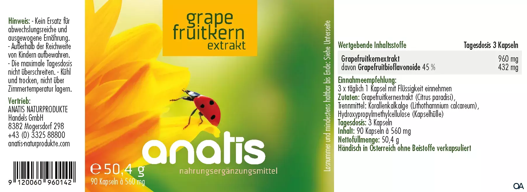 anatis Grapefruitkernextrakt Kapseln ist ein Nahrungsergänzungsmittel bestehend aus 100% reinem Grapefruitkernextrakt aus Kaltwasserauszug, enthält 45% Bioflavonoide.