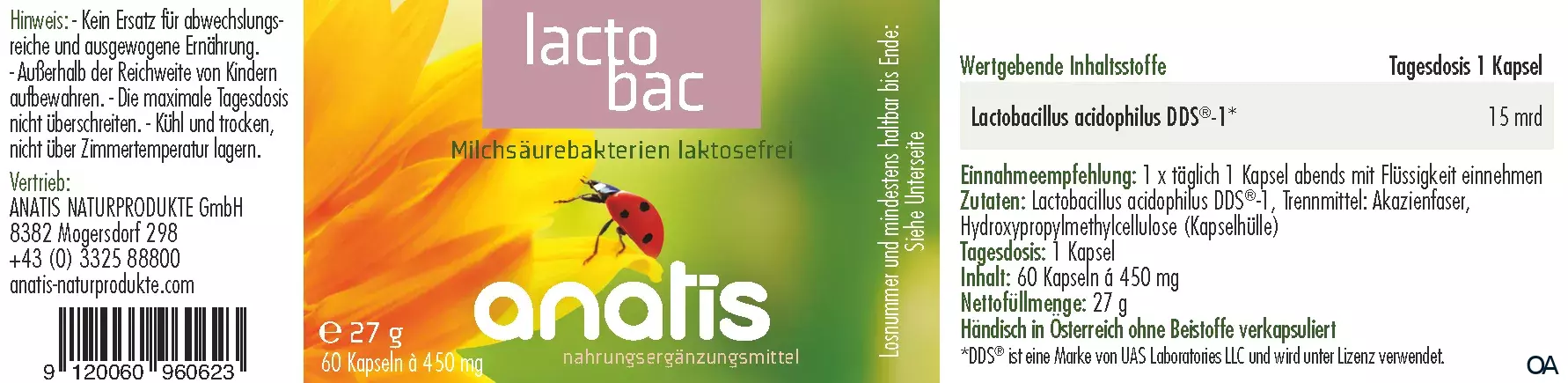anatis Lactobac Darmbakterien Kapseln ist ein Nahrungsergänzungsmittel bestehend aus Lactobazillus Acidophilus Bakterienkultur. Beinhaltet eine extrem hohe Anzahl an lebensfähigen Keimen - 15 Milliarden pro Kapsel. Magensaft und Gallensaft resistent.