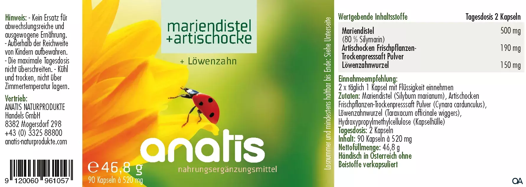 anatis Mariendistel + Artischocke Kapseln ist ein Nahrungsergänzungsmittel bestehend aus 250 mg Mariendistel (80 % Silymarin), 95 mg Artischocken-Frischpflanzensaft getrocknet und 75 mg Löwenzahnwurzel pro Kapsel.