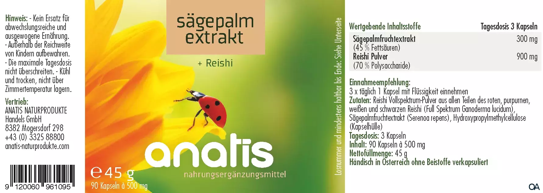 anatis Sägepalmextrakt+Reishi Kapseln ist ein Nahrungsergänzungsmittel mit 100 mg 45 %-iger Sägepalmfruchtextrakt pro Kapsel.