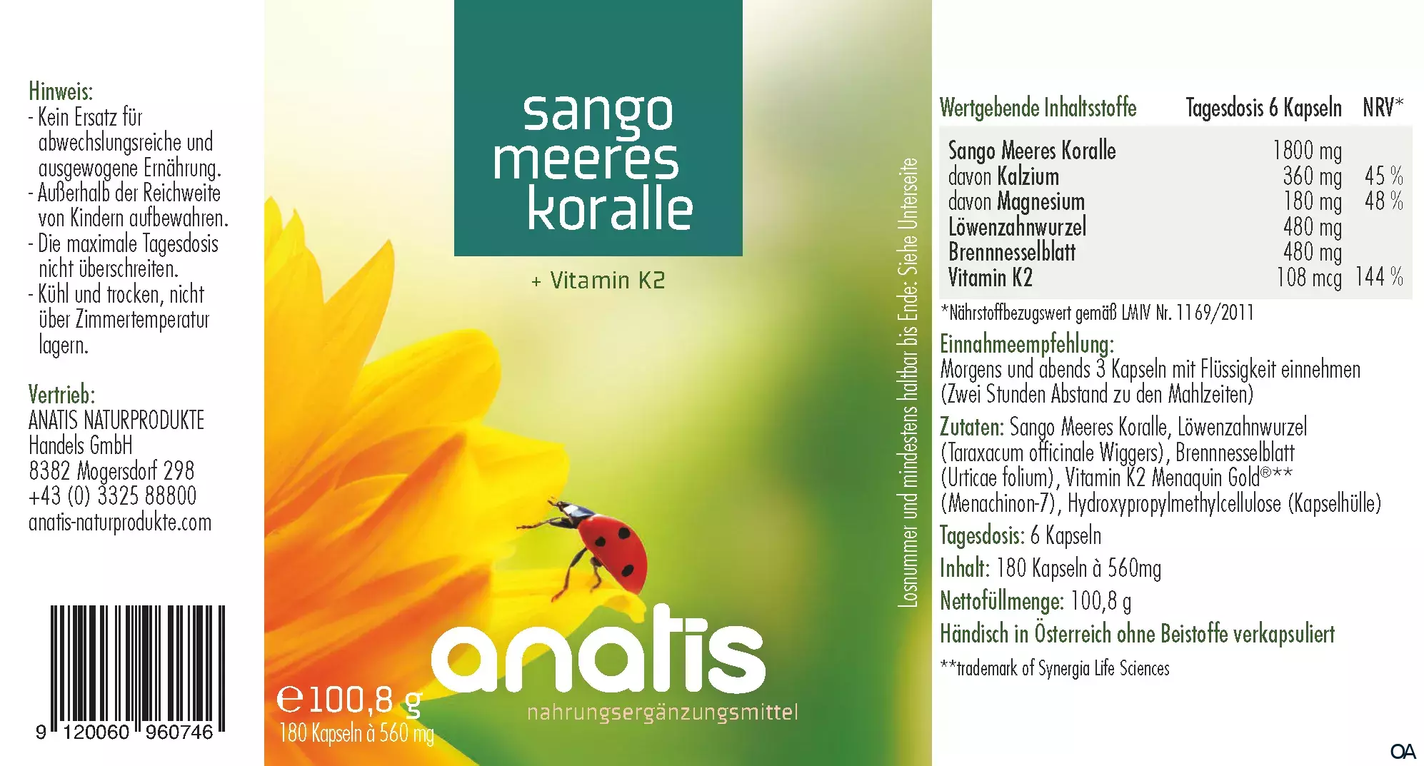- Zutaten: Sango Meeres Koralle, Löwenzahnwurzel (Taraxacum officinale Wiggers), Brennnesselblatt (Urticae folium), Vitamin K2 (Menachinon-7), Hydroxypropylmethylcellulose (Kapselhülle)