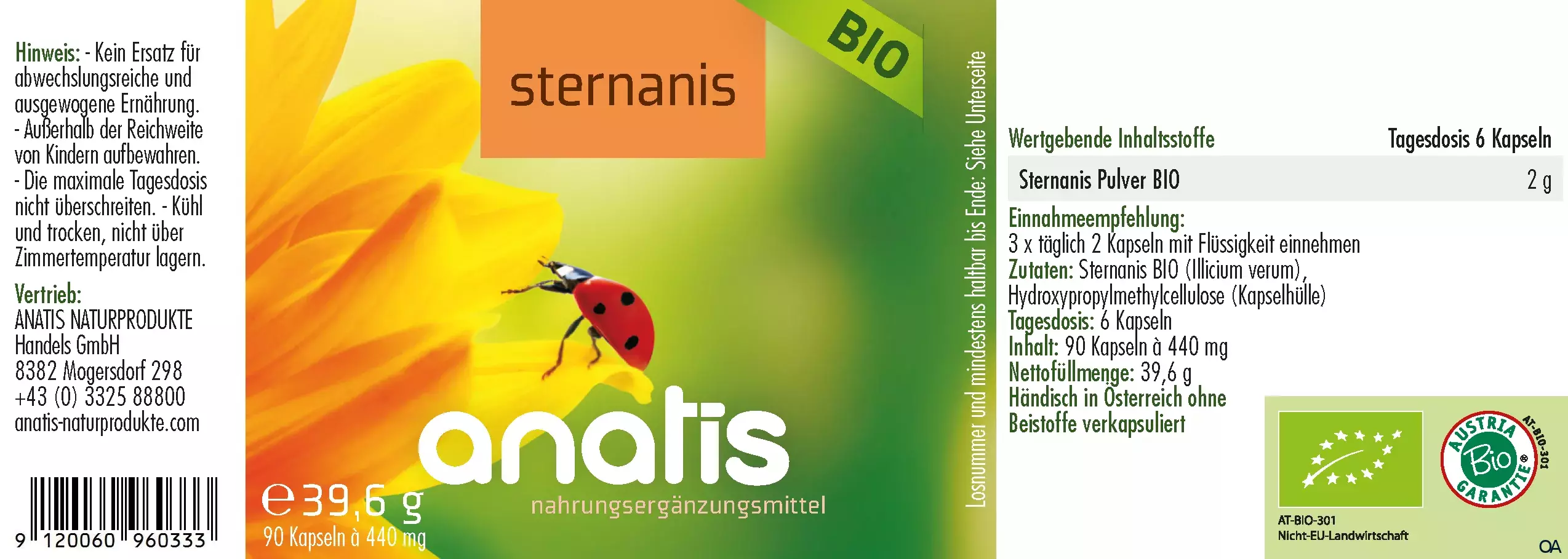 - Zutaten: Sternanis BIO (Illicium verum), Hydroxypropylmethylcellulose (Kapselhülle)
