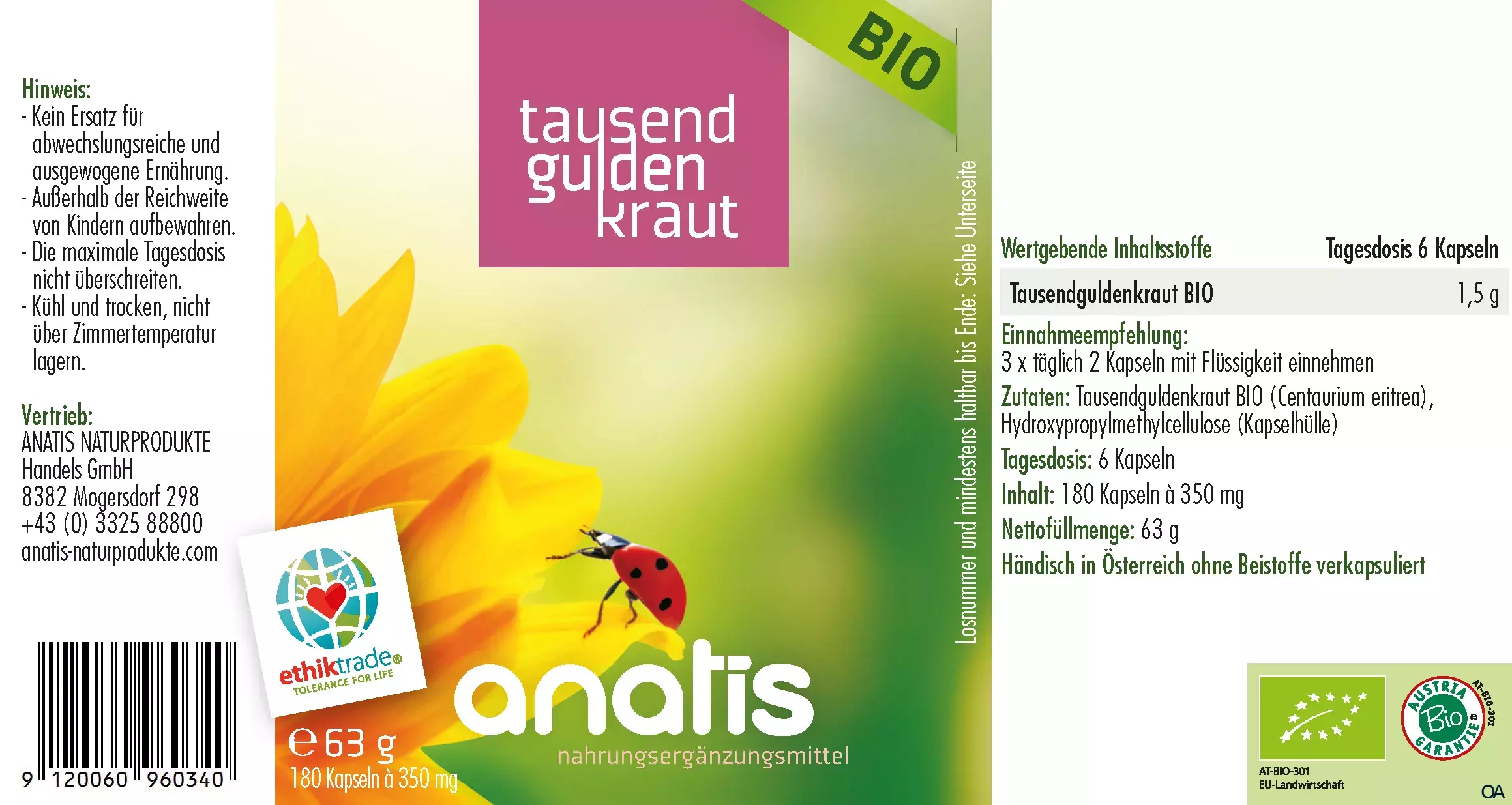 anatis Tausendguldenkraut BIO Kapseln ist ein Nahrungsergänzungsmittel mit Tausendguldenkraut einem bitterschmeckendem Wildkraut aus Wildsammlung zur angenehmen Einnahme in Kapseln.