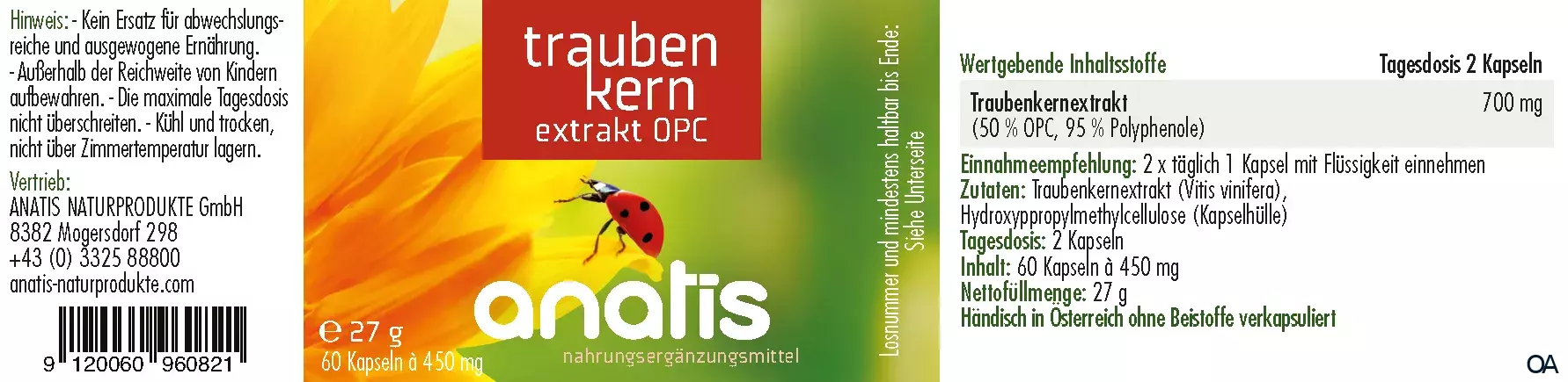 anatis Traubenkernextrakt OPC Kapseln ist ein Nahrungsergänzungsmittel bestehend aus purem Traubenkernextrakt. Enthält 350 mg OPC pro Tagesdosis.