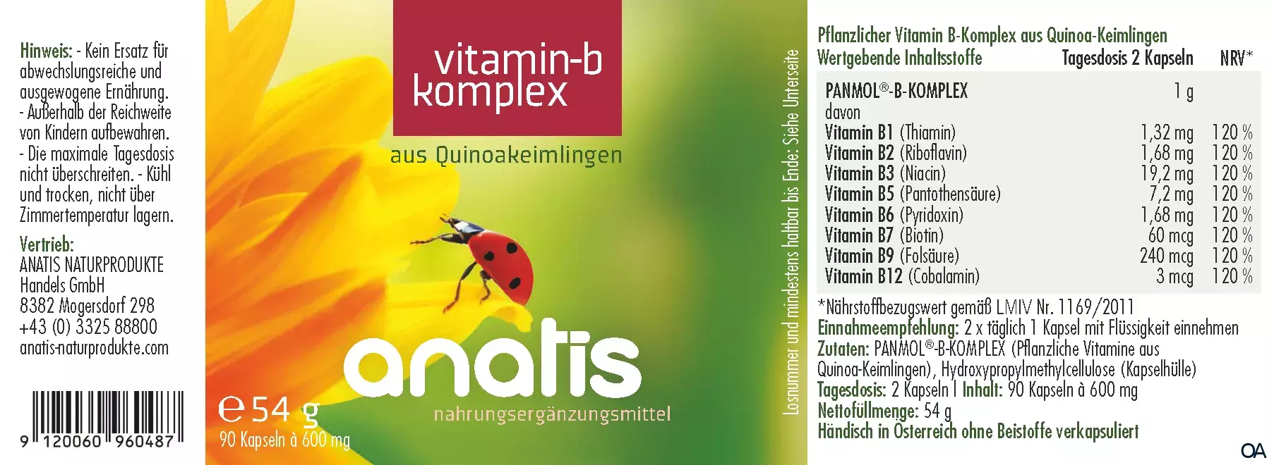 anatis Vitamin B Komplex Kapseln ist eine Nahrungsergänzungsmittel-Kombination bestehend aus 8 B Vitaminen. Der Vitamin B Komplex wird aus Quinoakeimlingen hergestellt.