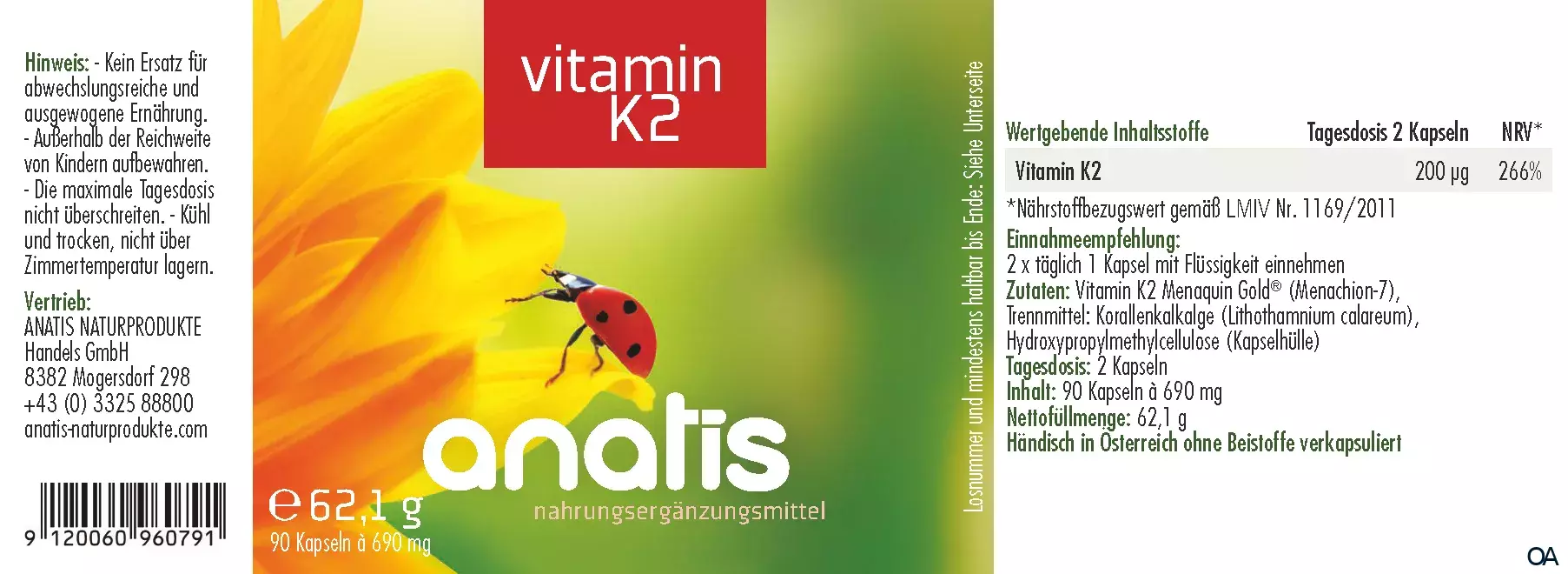 anatis Vitamin K2 Kapseln ist ein Nahrungsergänzungsmittel bestehend aus 100 mcg Vitamin K2 pro Kapsel.