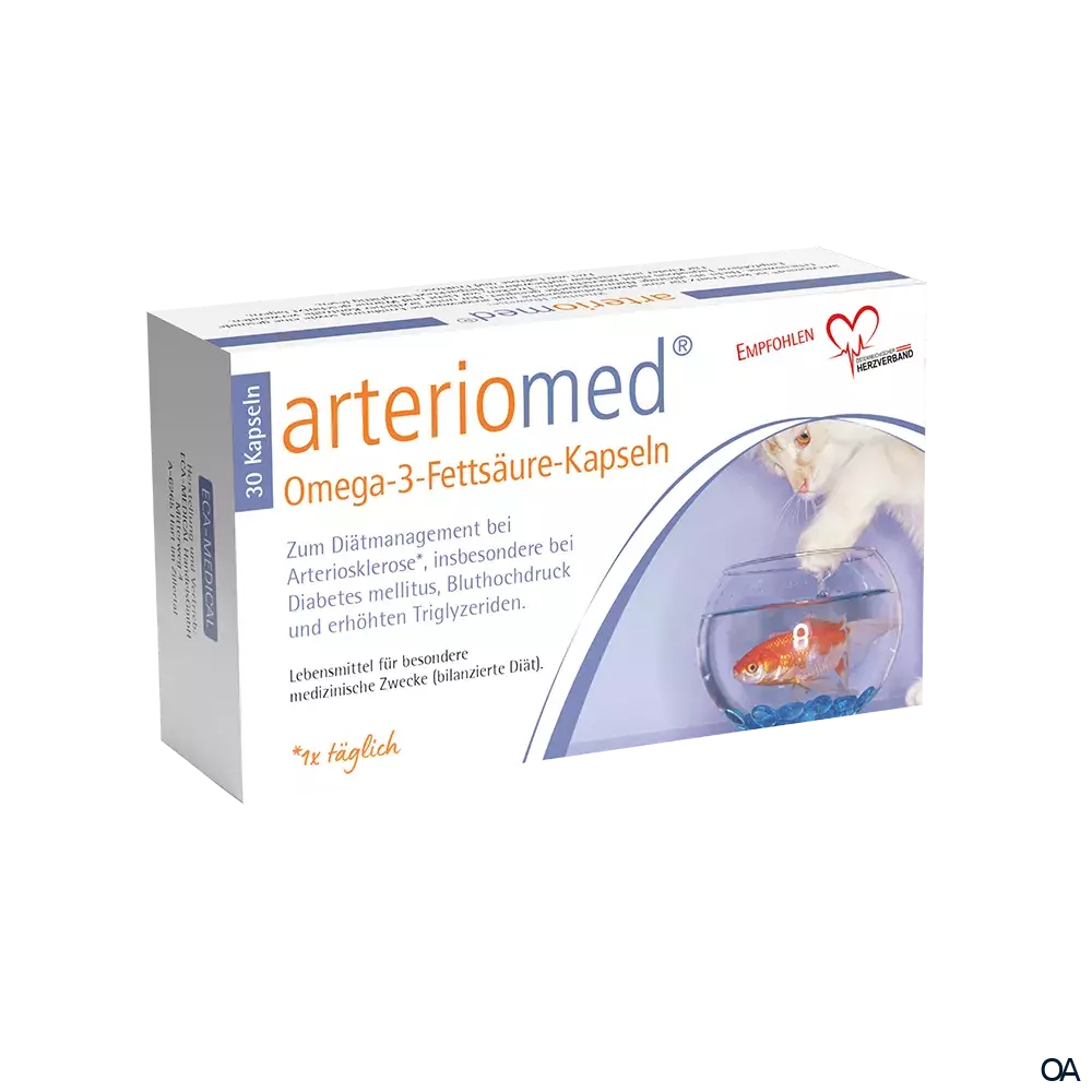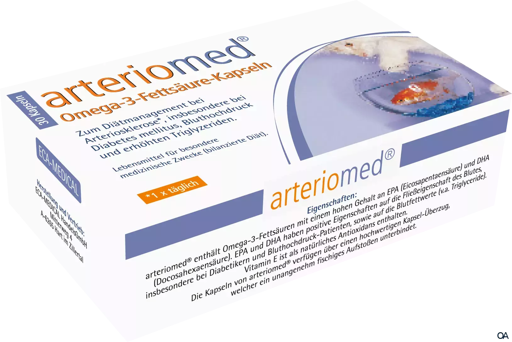 - arteriomed® enthält Omega-3-Fettsäuren natürlichen Ursprungs in hochkonzentrierter Form sowie Vitamin E als natürliches Antioxidans und ist auf den besonderen Ernährungsbedarf von Personen mit Arteriosklerose insbesondere bei Diabetes mellitus, Bluthochdruck und erhöhten Triglyceriden, abgestimmt.