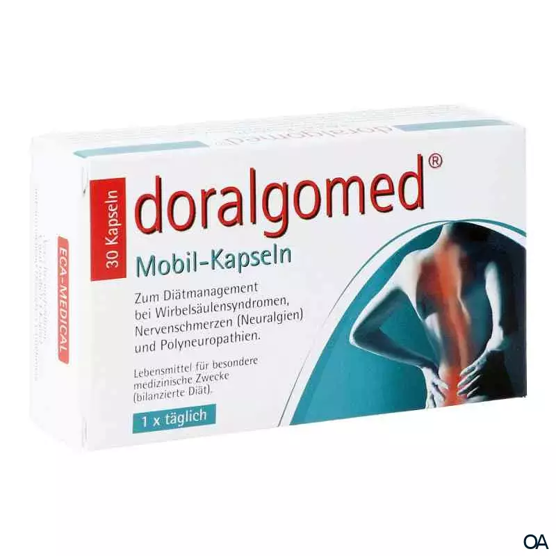 doralgomed® dient zur diätetischen Behandlung von Wirbelsäulensyndromen, (z.B. Rückenschmerzen, Hexenschuss, Schulter-Arm-Syndrom, HWS-Syndrom...), Nervenschmerzen (Neuralgien) und Polyneuropathien (z.B. diabetische Polyneuropathie).
