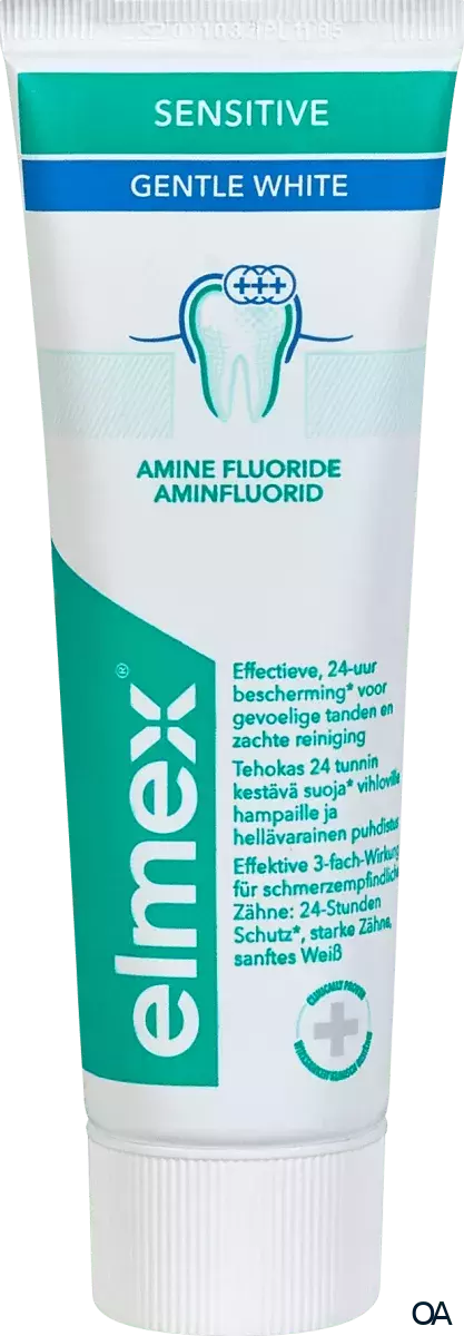 Zieht sich das Zahnfleisch zurück, werden die empfindlichen Zahnhälse mit dem weichen Dentin freigelegt. Dann können äußere Reize wie heiß/kalt oder süß/sauer Schmerzempfindungen auslösen. elmex® SENSITIVE GENTLE WHITE Zahnpasta reinigt empfindliche Zahnhälse sanft und schonend. Die Schmerzempfindlichkeit wird gehemmt und vor Zahnhalskaries dank hochwirksamen Aminfluorid (1400ppm Fluorid) geschützt. Spezielle Putzkörper sorgen für eine gründliche und schonende Reinigung der Zahnoberflächen.