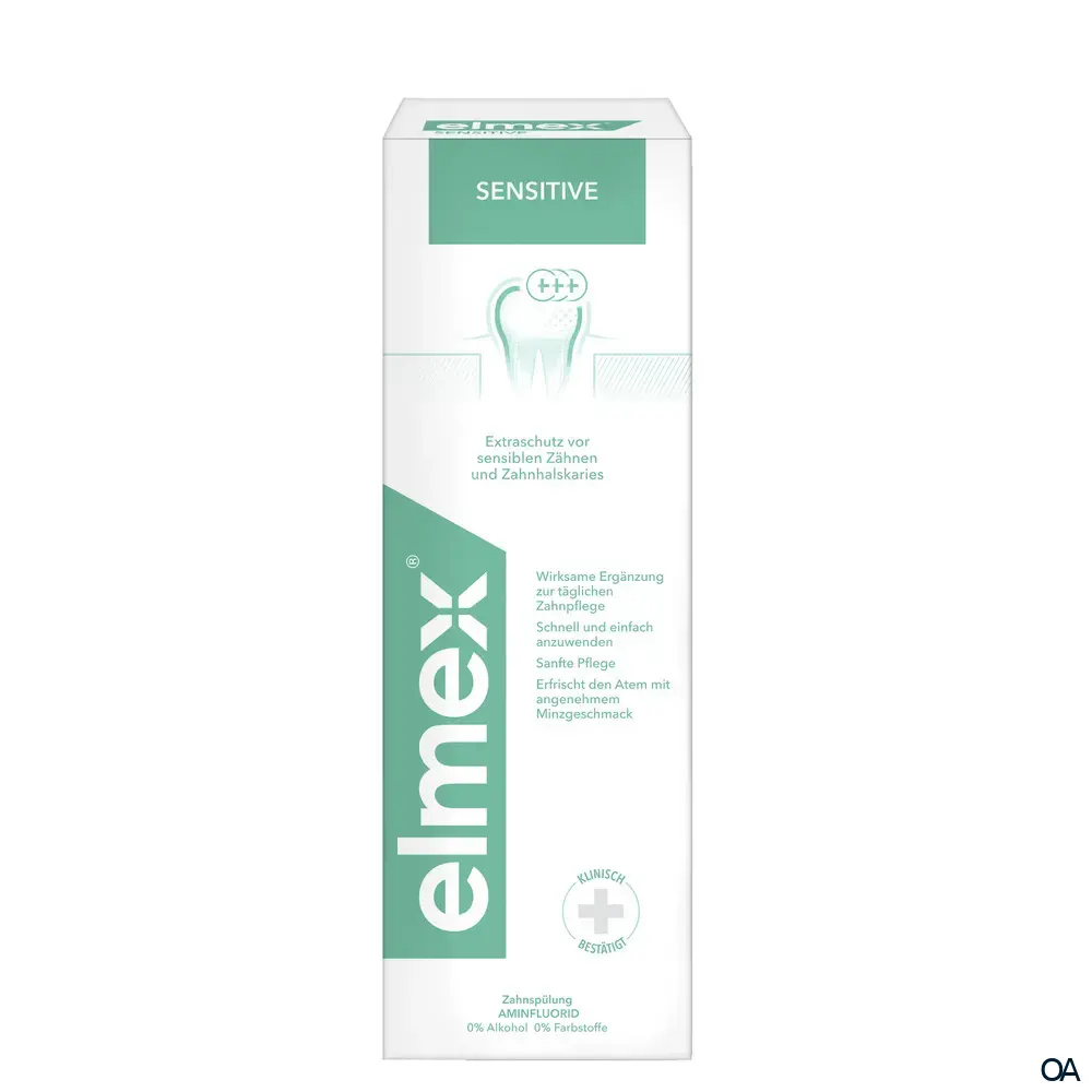 elmex® SENSITIVE PLUS Zahnspülung hilft die Reizleiterkanälchen zu verschließen und reduziert somit die Schmerzempfindlichkeit. Der Schutz vor Zahnhalskaries wird durch das enthaltene Aminfluorid (250ppm Fluorid) intensiviert. Das Produkt ist frei von Alkohol und Farbstoffen.