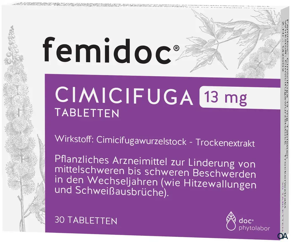 Die femidoc® CIMICIFUGA 13 mg Tabletten sind ein pflanzliches Arzneimittel zur Linderung von mittelschweren bis schweren Beschwerden in den Wechseljahren (wie Hitzewallungen und Schweißausbrüche). Zur Anwendung bei Frauen in den Wechseljahren.