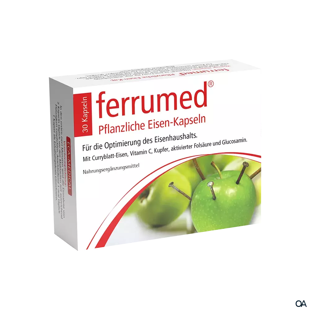 ferrumed® enthält das rein pflanzliche Curryblatt-Eisen mit hoher Bioverfügbarkeit und sehr guter Verträglichkeit. Eisen unterstützt die Bildung von roten Blutkörperchen und Hämoglobin, sorgt für einen normalen Sauerstofftransport im Körper und verringert Müdigkeit und Ermüdungserscheinungen. Vitamin C erhöht die Eisenaufnahme und Kupfer sorgt für einen normalen Eisentransport im Körper. Folsäure ist zusätzlich an der Zellteilung beteiligt und unterstützt die Blutbildung.