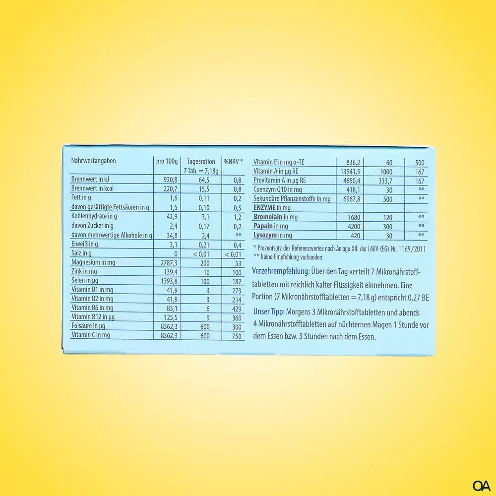 - Nährwertinformationen pro Tagesdosis (7Tabletten) %NRV*: Brennwert in kJ 64,5 0,8, Brennwert in kcal 15,5 0,8, Fett in g 0,11 0,2 davon gesättigte Fettsäuren in g 0,10 0,5, Kohlenhydrate in g 3,1 1,2 davon Zucker in g 0,17 0,2 davon mehrwertige Alkohole in g 2,4 **, Eiweiß in g 0,21 0,4, Salz in g < 0,01 <0,01. Bromelain 120 **, Papain 300 **, Lysozym 30 **, Coenzym Q10 in mg 30 **, Sekundäre Pflanzstoffe in mg 500 **, Magnesium in mg 200 53, Zink in mg 10 100, Selen in µg 100 182, Vitamin B1 in mg 3 273, Vitamin B2 in mg 3 214, Vitamin B6 in mg 6 429, Vitamin B12 in µg 9 360, Folsäure in µg 600 300, Vitamin C in mg 600 750, Vitamin E in mg 60 500, Vitamin A als RE in µg 1000 167 Provitamin A als RE in µg 333,7. * Prozentsatz des Referenzwertes nach Anlage XIII der LMIV (EG) Nr. 1169/2011. ** keine Empfehlung vorhanden.