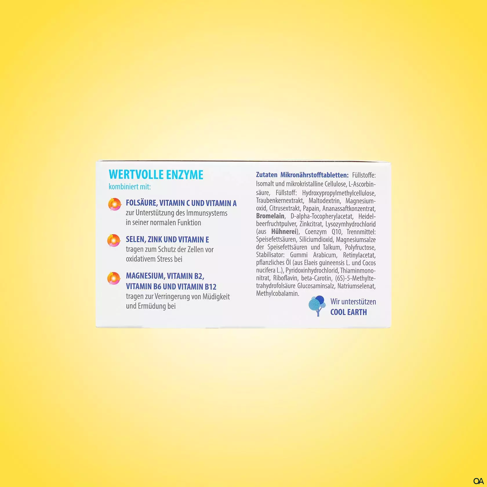 - Zutaten: Füllstoffe: Isomalt und mikrokristalline Cellulose, L-Ascorbinsäure, Füllstoff: Hydroxypropylmethylcellulose, Traubenkernextrakt, Maltodextrin, Magnesiumoxid, Citrusextrakt, Papain, Ananassaftkonzentrat, Bromelain, D-alpha-Tocopherylacetat, Heidelbeerfruchtpulver, Zinkcitrat, Lysozymhydrochlorid (aus Hühnerei), Coenzym Q10, Trennmittel: Speisefettsäuren, Siliciumdioxid, Magnesiumsalze der Speisefettsäuren und Talkum, Polyfructose, Stabilisator: Gummi Arabicum, Retinylacetat, pflanzliches Öl (aus Elaeis guineensis L. und Cocos nucifera L.), Pyridoxinhydrochlorid, Thiaminmononitrat, Riboflavin, Beta-Carotin, (6S)-5-Methyltetrahydrofolsäure Glucosaminsalz, Natriumselenat, Methylcobalamin. Kann bei übermäßigem Verzehr abführend wirken.
