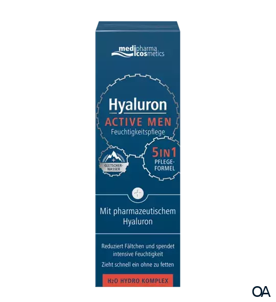 Die medipharma comsmetics Hyaluron Active Men Feuchtigkeitspflege mit pharmazeutischem Hyaluron reduziert Fältchen und spendet intensive Feuchtigkeit. Ideal für die normale bis trockene Haut mit H2O Hydro Komplex mit 5 in 1 Pflegeformel und Gletscherwasser.