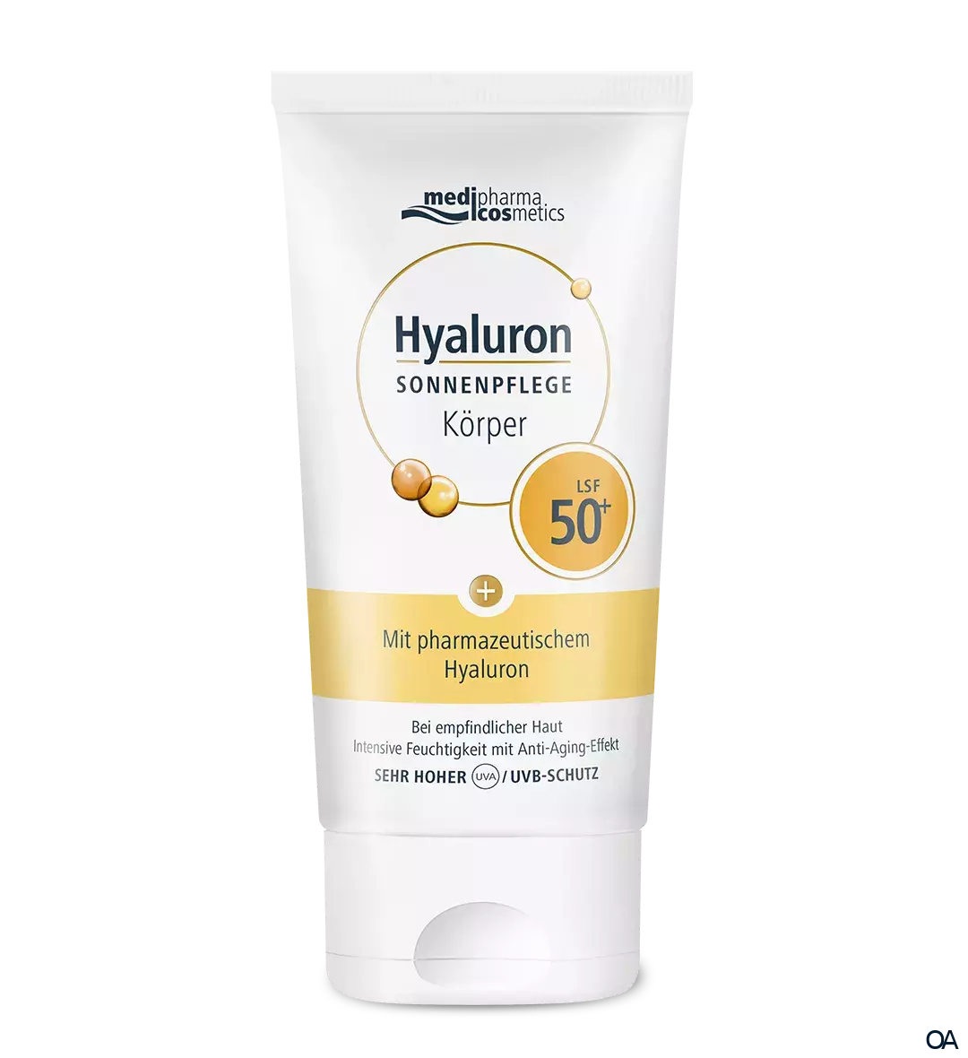 Die Hyaluron Sonnenpflege Körper LSF 50+ von medipharma cosmetics bietet auch empfindlichen Hauttypen sehr hohe Sicherheit und Hautschutz bei intensiver Sonneneinstrahlung. Der enthaltene Wirkkomplex mit Hyaluronsäure in pharmazeutischer Qualität und Anti-Aging-Effekt gleicht den Feuchtigkeitsverlust der Haut ideal aus, strafft und festigt die Körpersilhouette.