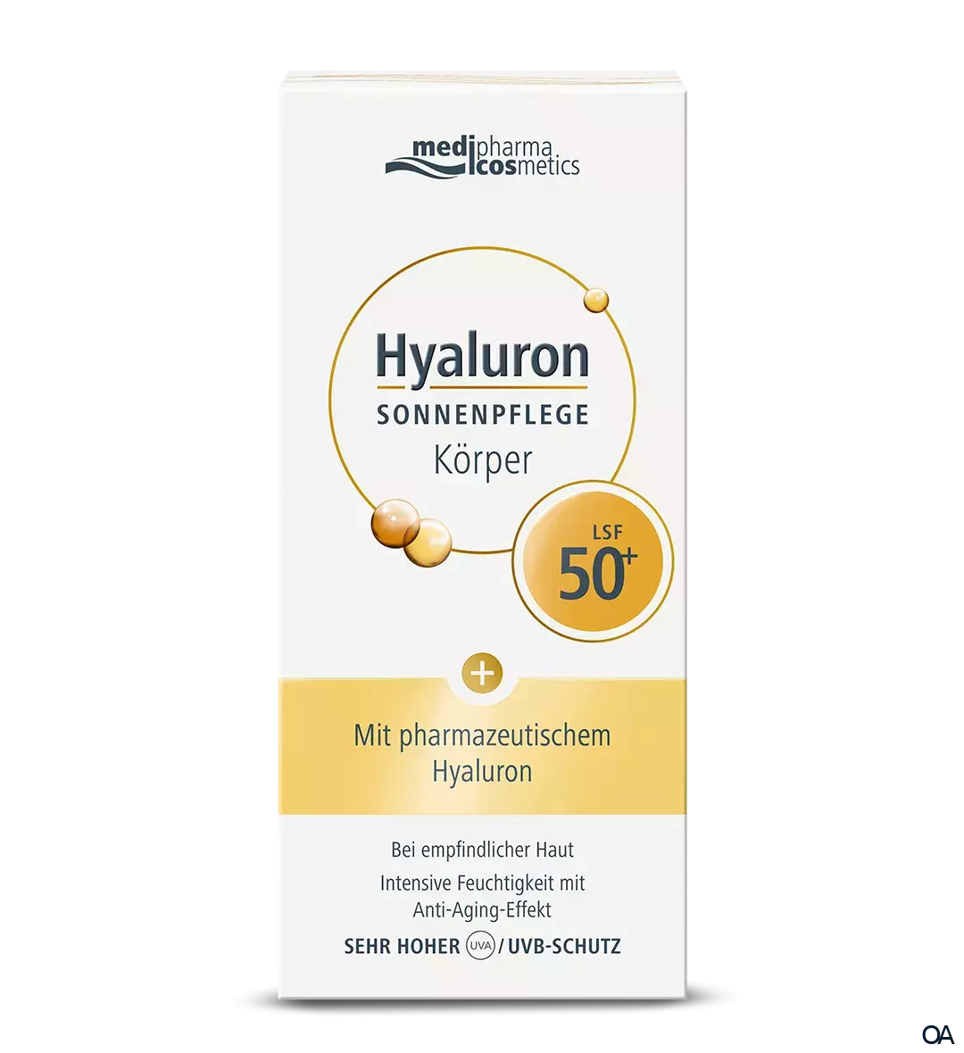 Die medipharma cosmetics Hyaluron Sonnenpflege Körper LSF 50+ mit pharmazeutischem Hyaluron schützt, spendet Feuchtigkeit, strafft und festigt die empfindliche Haut. Mit Anti-Aging Effekt und sehr hohem UVA-/UVB-Schutz.
