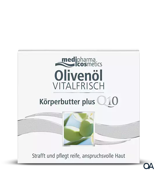 Die medipharma cosmetics Olivenöl Vitalfrisch Körperbutter plus Q10 mit kaltgepresstem Olivenöl, Olivenblattextrakt, reinem Q 10 und wertvollem Vitamin E, strafft und pflegt reife, anspruchsvolle Haut.