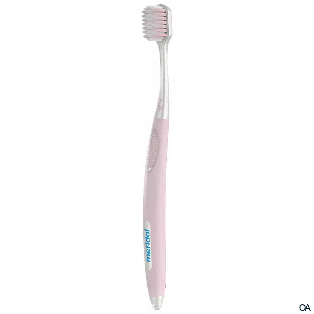 meridol® Rundumpflege Zahnbürste für schmerzempfindliches Zahnfleisch und sensible Zähne. Ergonomisch geformter Griff (aus 40% recyceltem Kunststoff) ermöglicht eine kontrollierte und bequeme Handhabung.