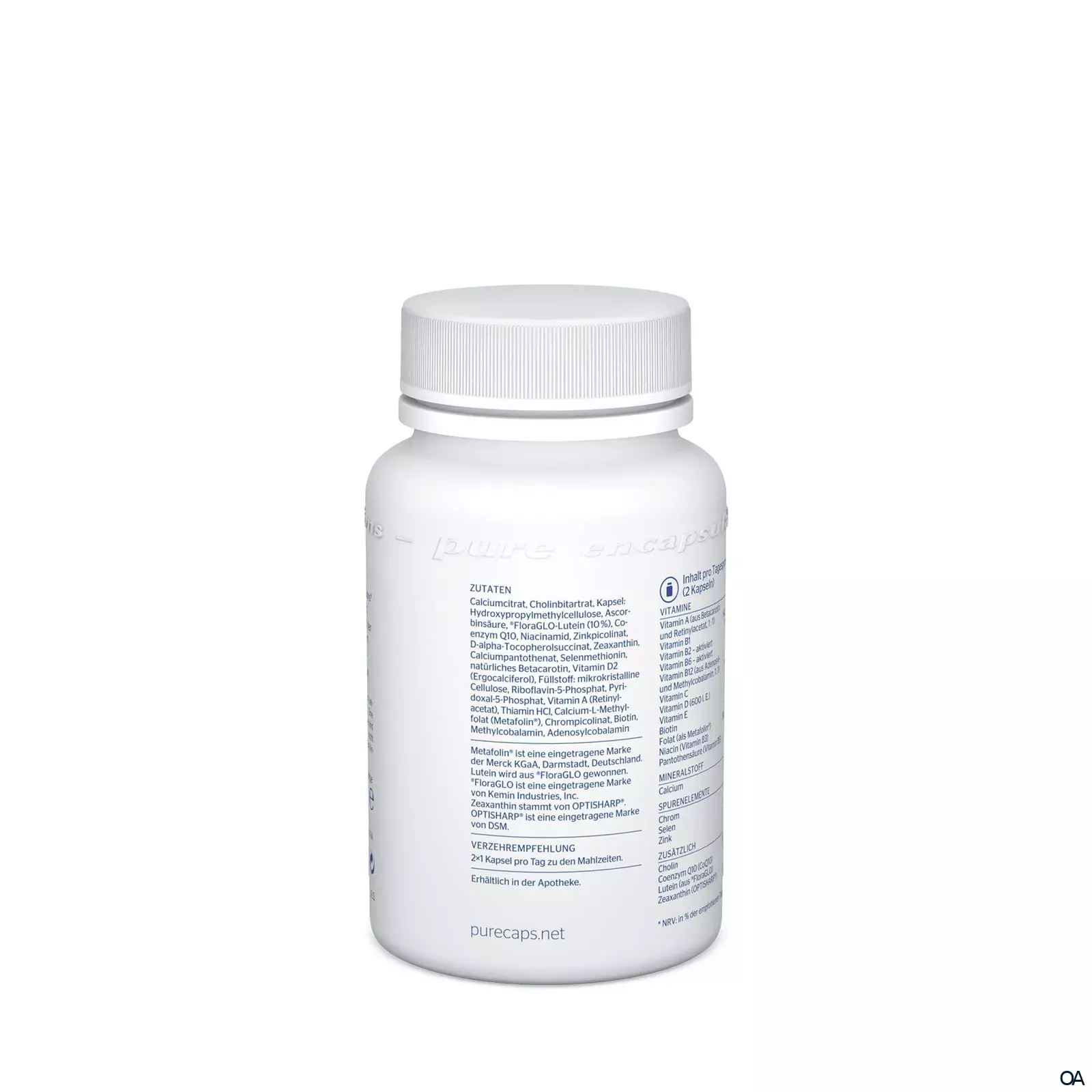 - Zutaten: Calciumcitrat, Cholinbitartrat, Kapsel: Hydroxypropylmethylcellulose, Ascor binsäure, ®FloraGLO-Lutein, Co enzym Q10, Niacinamid, Zinkpicolinat, D-alpha-Tocopherolsuccinat, Zeaxanthin, Calciumpantothenat, Selenmethionin, natürliches Betacarotin (Betanat®, 10 %), Vitamin D2 (Ergocalciferol), Füllstoff: mikrokristalline Cellulose, Riboflavin-5- Phosphat, Pyridoxal-5-Phosphat, Vitamin A (Retinylacetat), Thiamin HCl, Calcium-L- Methylfolat (Metafolin®), Chrompicolinat, Biotin, Methylcobalamin, Adeno sylcobalamin.
