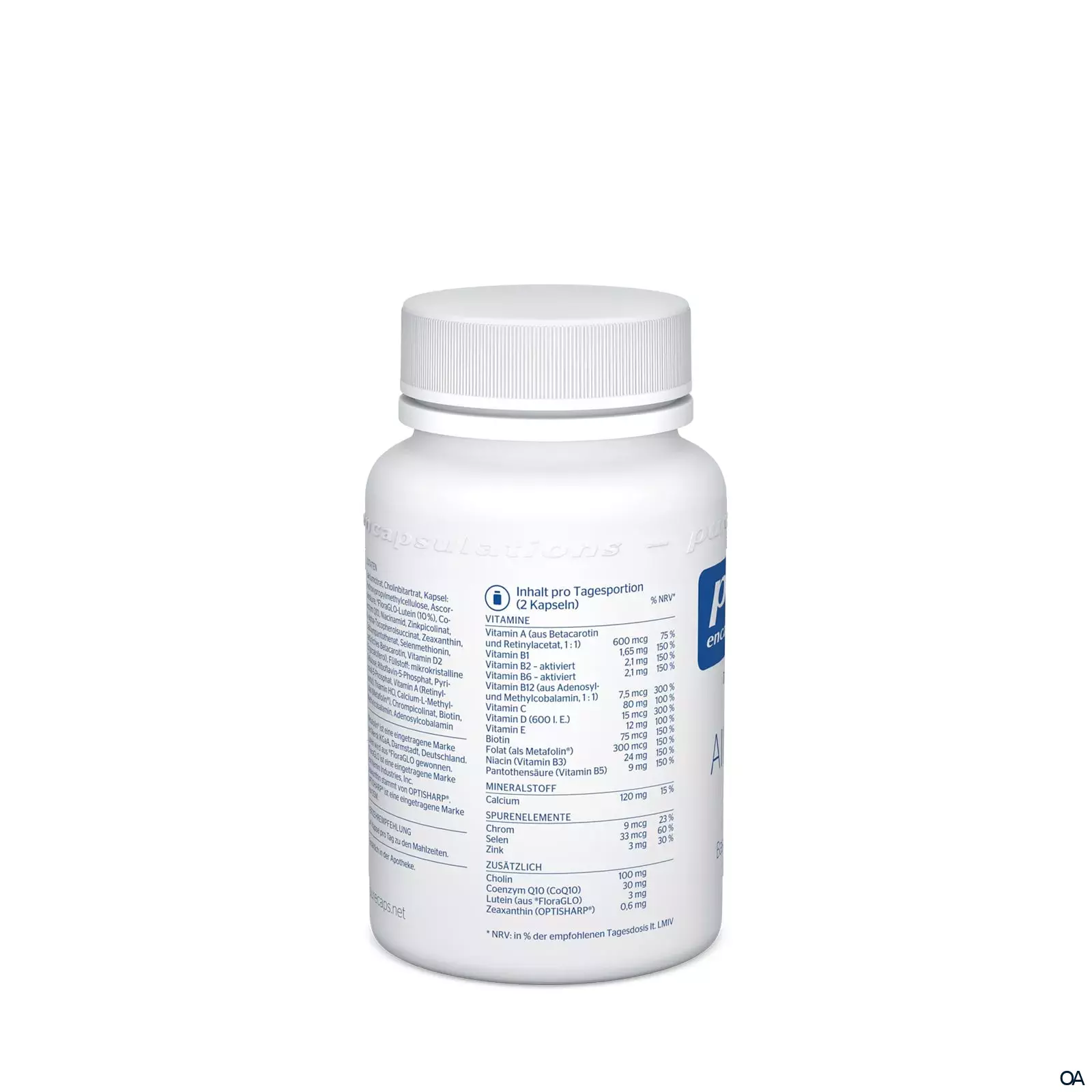 - Inhalt pro Tagesportion (2 Kapseln) Vitamine Vitamin A (aus Beta-Carotin und Retinylacetat, 1 : 1) 600 mcg Vitamin B1 1,65 mg Vitamin B2 – aktiviert 2,1 mg Vitamin B6 aktiviert 2,1 mg Vitamin B12 (aus Adenosyl- und Methylcobalamin, 1 : 1) 7,5 mcg Vitamin C 80 mg Vitamin D (600 I.E.) 15 mcg Vitamin E 12 mg Biotin 75 mcg Folat (als Metafolin®)1 300 mcg Niacin (Vitamin B3) 24 mg Pantothensäure (Vitamin B5) 9 mg Mineralstoff Calcium 120 mg Spurenelemente Chrom 9 mcg Selen 33 mcg Zink 3 mg Zusätzlich Cholin 100 mg Coenzym Q10 (CoQ10) 30 mg Lutein (aus ®FloraGLO)2 3 mg Zeaxanthin (OPTISHARP®)3 0,6 mg.1 Metafolin® ist eine eingetragene Marke der Merck KGaA, Darmstadt, Deutschland. 2 Lutein wird aus ®FloraGLO gewonnen. ®FloraGLO ist eine eingetragene Marke von Kemin Industries, Inc. 3 Zeaxanthin stammt von OPTISHARP®. OPTISHARP® ist eine eingetragene Marke von DSM.